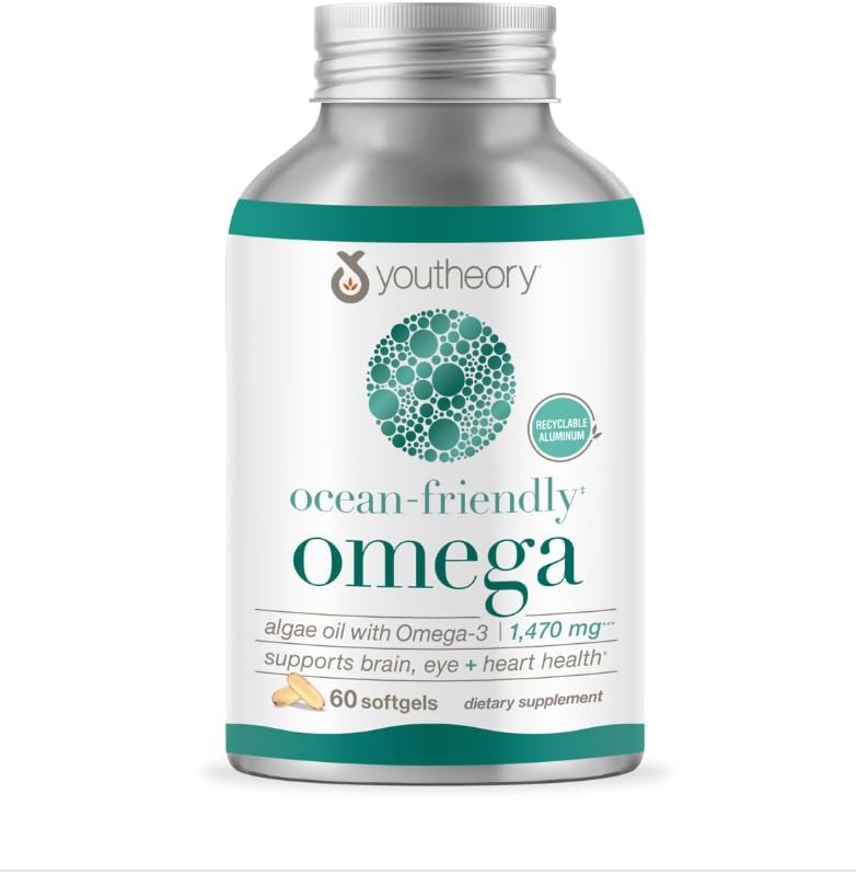 Support the overall health of your mind, body and the planet with Youtheory Ocean-Friendly Omega softgels. Packaged in a recyclable aluminum bottle, this fish-free omega-3 is created with plant-based algae oil. It supplies DHA and EPA, two essential fatty acids that support healthy brain, eye and heart function — all with no fishy aftertaste.Dosage: 2 softgels per day. Recyclable aluminum bottle. 450mg of DHA and 140mg of EPA. 770mg of Omega-3s per serving. Omega-3 supplement sourced from fish-free algae oil 100 plant based.
