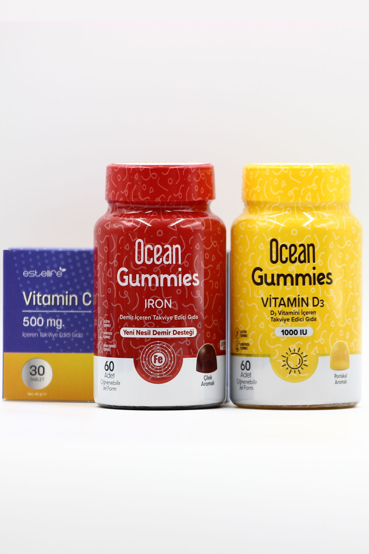 Demir, D vitamini ve C vitamini ihtiyacinizi karsilayacak bu güçlü takviye seti ile bagisiklik sisteminizi güçlendirin ve enerji seviyenizi artirin!Estellife Vitamin Cile bagisikliginizi güçlendirin,Ocean Gummies Ironile demir eksikligini giderin,Ocean Gummies Vitamin D3ile kemik ve bagisiklik sagliginizi destekleyin.