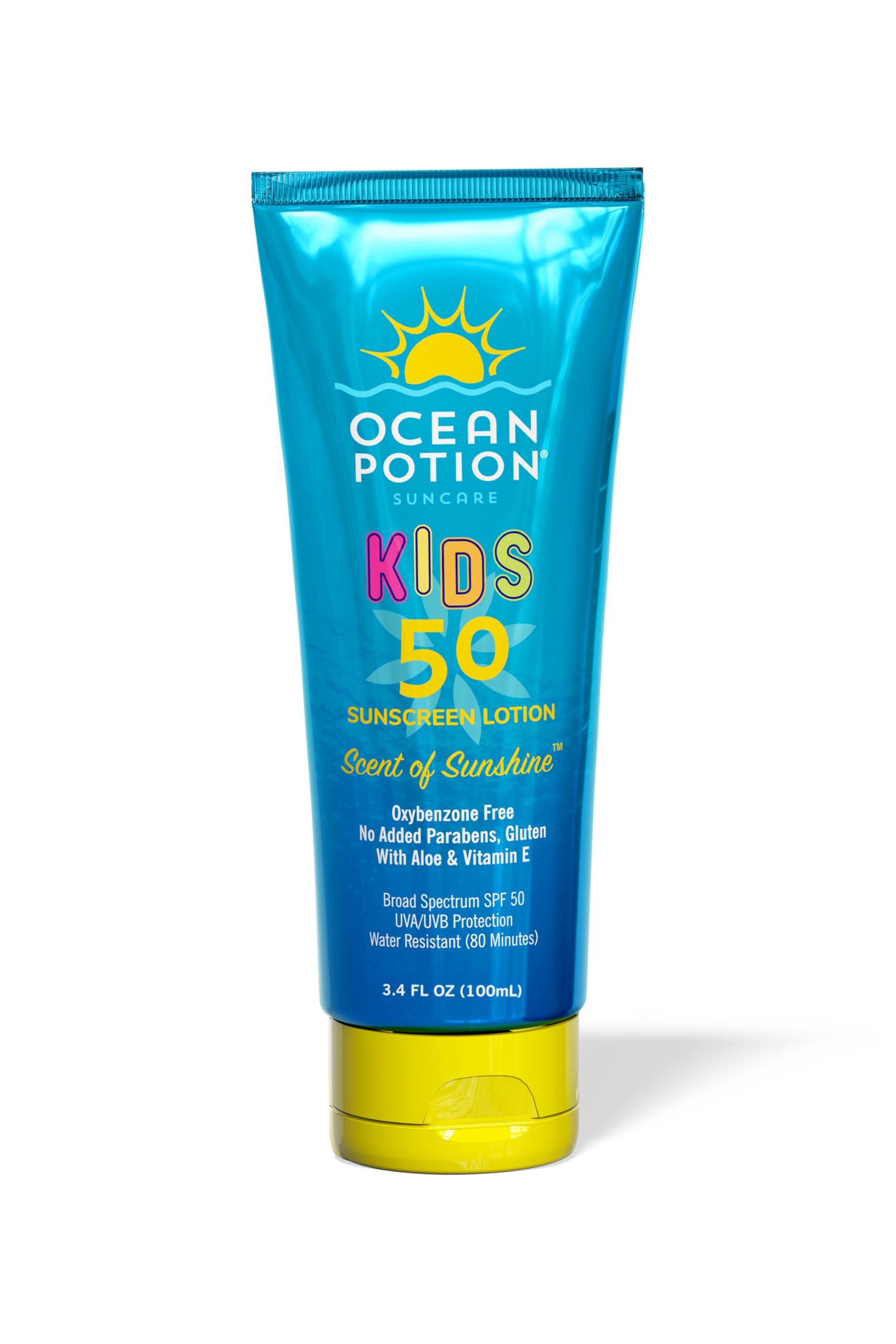 TRAVEL FRIENDLY SIZE - TSA APPROVED OCEAN POTION KIDS SPF 50 SUNSCREEN LOTION – 3.4OZ BROAD-SPECTRUM PROTECTION, WATER-RESISTANT, FRAGRANCE-FREE, PARABEN-FREE GLUTEN-FREE INCLUDES VITAMIN E ALOE Product Overview: Ocean Potion Kids SPF 50 Sunscreen Lotion is the perfect sun protection for active children who love spending time outdoors. This sunscreen provides broad-spectrum protection against both UVA and UVB rays, helping to protect your child's delicate skin from sunburn and damage. It is water-resistant for up to 80 minutes, making it ideal for water activities and sweating. Lightweight and fragrance-free, it's gentle on sensitive skin, ensuring your child stays comfortable while playing in the sun. Infused with Vitamin E and Aloe, this sunscreen also nourishes and soothes the skin. Free from oxybenzone, octinoxate, parabens, and gluten, it's a safe and eco-friendly option for your little one. KEY FEATURES: Broad-Spectrum Protection: Shields against both UVA and UVB rays, helping to prevent sunburn and skin damage. Water-Resistant: Stays on during water activities and sweating for up to 80 minutes, ensuring long-lasting protection. Fragrance-Free Lightweight: Gentle on sensitive skin with a fragrance-free, non-greasy formula that absorbs quickly and won't weigh your child down. Nourishing Formula: Enriched with Vitamin E and Aloe to soothe and hydrate your child's skin. Free from Harsh Chemicals: Free from oxybenzone, octinoxate, parabens, and gluten, providing a safer option for your child's skin. WHY CHOOSE OCEAN POTION? Ocean Potion Kids SPF 50 Sunscreen Lotion is specially designed to provide trusted sun protection for your child's active outdoor lifestyle. Offering high endurance, water resistance, and nourishment from Vitamin E and Aloe, this sunscreen ensures your child stays protected while having fun in the sun. Plus, it's free from harmful chemicals, giving you peace of mind knowing you're using a safe, eco-friendly product. PERFECT FOR: Beach pool days Water sports swimming Outdoor play sports Hiking adventures DIRECTIONS FOR USE: Apply generously and evenly to exposed skin 15 minutes before sun exposure. Reapply every 2 hours, or immediately after swimming, sweating, or towel drying. Size: 3.4oz Ingredients: Vitamin E, Aloe, oxybenzone-free, octinoxate-free, paraben-free, gluten-free, and formulated with skin-safe, eco-friendly ingredients.Water Resistant (80 Minutes). UVA UVB Protection. Enriched with Aloe Leaf Vitamin E. No Added Parabens or Gluten. Oxybenzone Free.