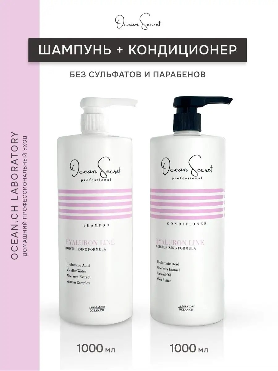 Представляем наш абсолютный бестселлер - уходовый набор из бессульфатного шампуня и кондиционера из линейки HYALURON LINE. Набор идеально подходит для всех типов волос и кожи головы, включая чувствительную, жирную, сухую и нормальную кожу. Состав без сульфатов поддерживает оптимальный pH здоровой кожи головы, сохраняя защиту ее иммунитета. Комплекс, обогащенный натуральным кокосовым и миндальным маслами, гиалуроновой кислотой и протеинами пшеницы предотвращает сухость, увлажняет волосы и придаст прическе ухоженный вид. Роскошь натурального масла ши увлажняет и укрепляет стержень волоса, делает его эластичным и придает эффект зеркального блеска, гладкости и шелковистости. Безсульфатная косметика OCEAN SECRET HYALURON LINE является универсальным решением для ускоренного восстановления волос после кератинового выпрямления, ботокса, нанопластики, салонных процедур и частой укладки. Шампунь надолго сохраняет чистоту и свежесть жирных корней и борется с выпадением, активизирует рост новых волос и возрождает их густоту и здоровье. Кондиционер-маска восстанавливает и увлажняет поврежденные кончики волос, предотвращает их сечение и укрощает пушистые непослушные локоны, избавляя их от неопрятной пышности, облегчая укладку и сохраняя её форму. Смываемый бальзам-ополаскиватель дарит идеальное восстановление и питание, устраняет ломкость и укрепляет структуру волос по всей длине, благодаря уплотняющему эффекту без утяжеления. Комплекс подходит для ухода за окрашенными волосами, мелированными и после осветления, гарантирует защиту цвета и продлевает его яркость и сияние.