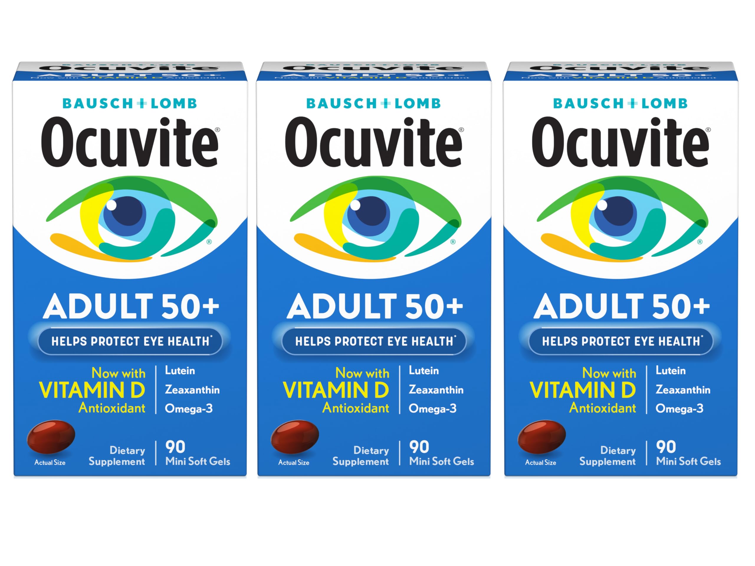 Ocuvite Adult 50 eye vitamins and mineral supplements contain essential eye nutrient levels not found in most leading multivitamins and often not obtained in sufficient quantities through diet alone. From the eye care experts at Bausch Lomb, these eye health supplements for adults ages 50 and older help replenish the vital nutrients for eye health. Once-daily Ocuvite Adult 50 eye vitamin and mineral supplements contain 7 vital eye health nutrients including Lutein, Zeaxanthin, and Omega-3s from highly purified fish oil. Eye vitamins for adults ages 50 Replenish vital nutrients for eye health Once-daily MiniGel with no FD C dyes From the eye care experts at Bausch Lomb Vitamins C E–Antioxidants key to eye health