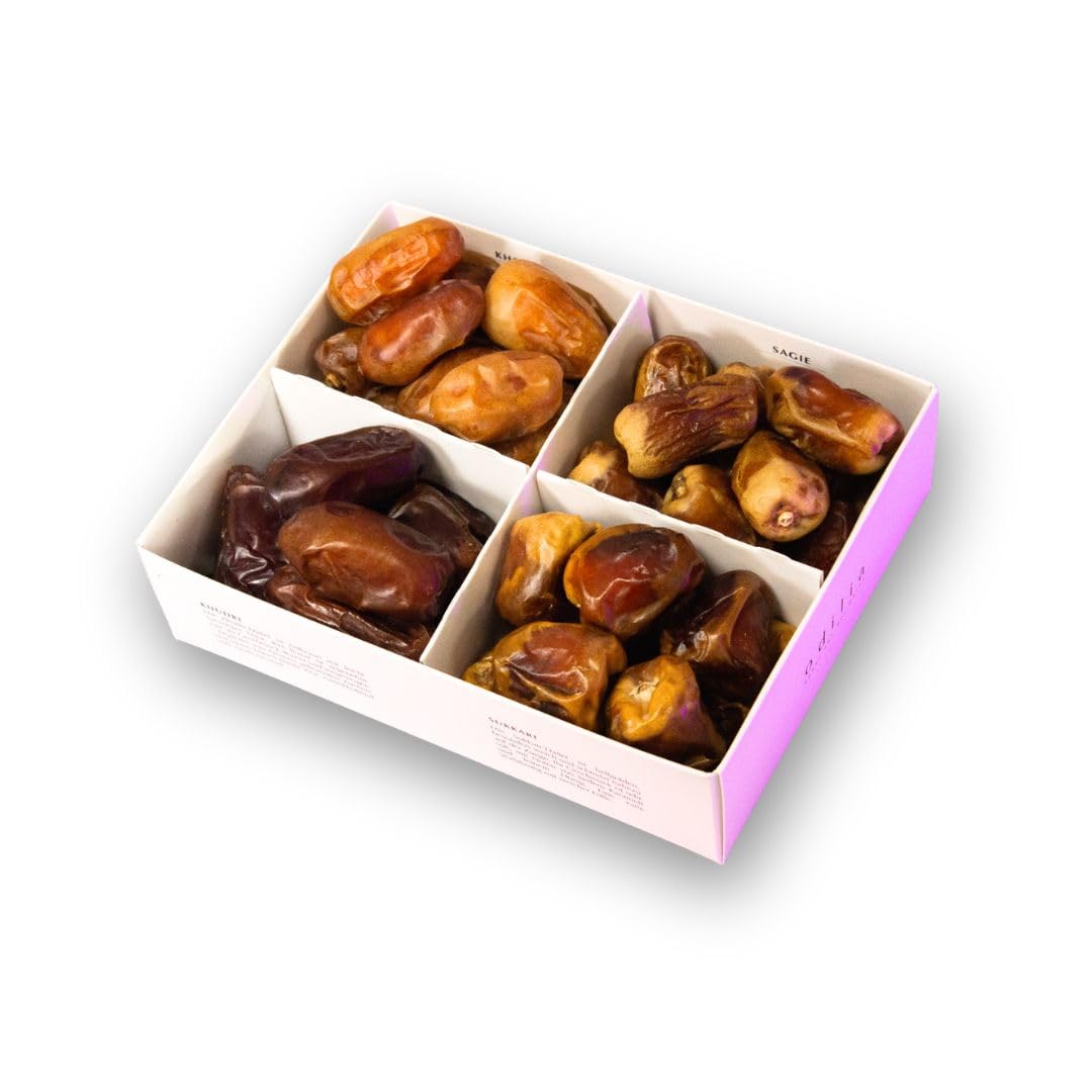 Odilia Desert Jewels – Variété exclusive de dattes bio (boîte de luxe 500 g) 4 variétés élégantes : sagie, khudri, kholas, sukkari Végétalien, sans gluten et sans sucre ajouté Idée cadeau