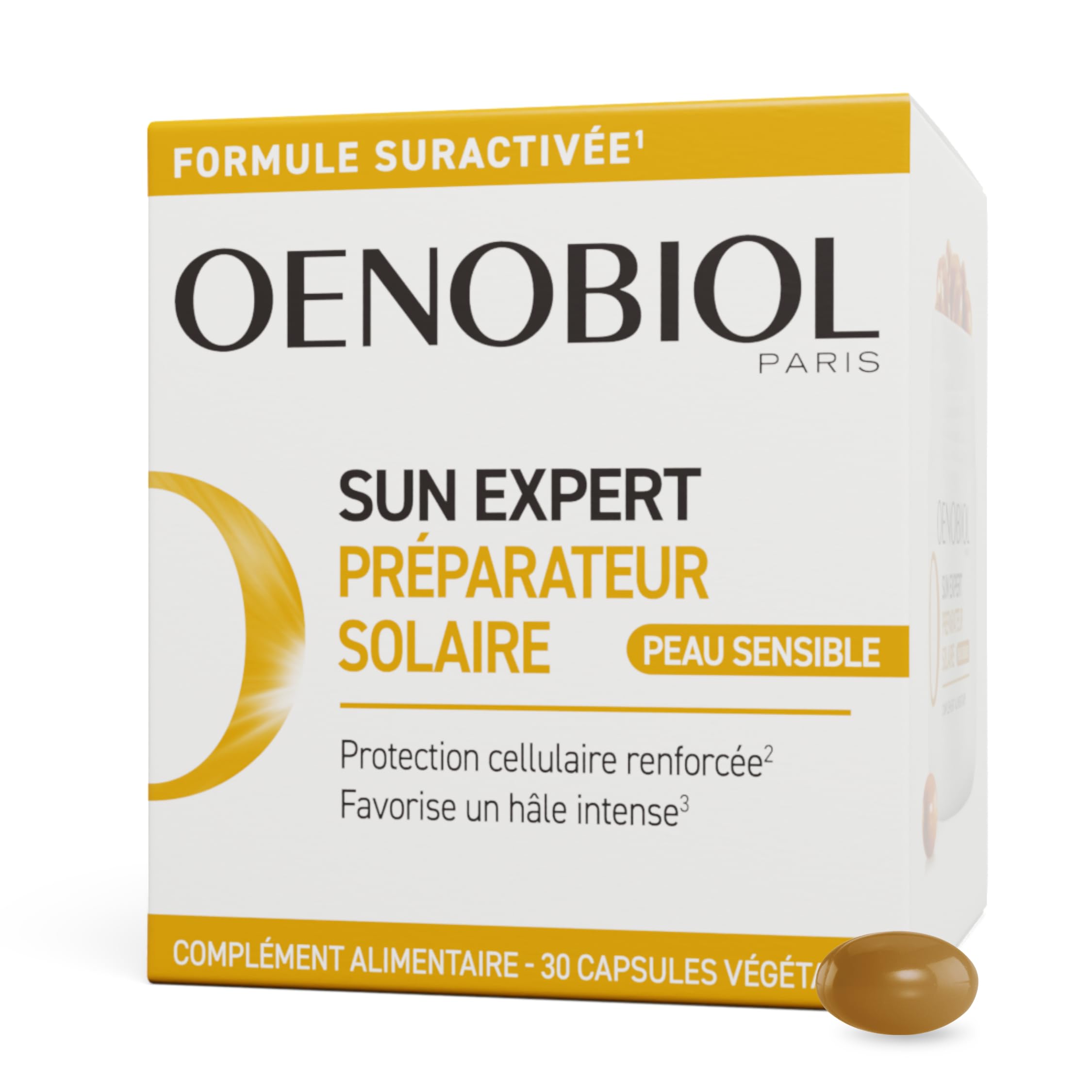 SUN EXPERT Sun Preparation is designed for all sun-sensitive skin types, offering tailored antioxidant cellular protection for optimal pre-sun preparation and a radiant, intense tan. At the heart of its supercharged formula, OENOBIOL innovates with Grape Marc, an exclusive active ingredient rich in natural polyphenols, clinically tested, combined with plant-based carotenoids and selenium, known for its protective properties against oxidative stress. Copper is a precursor to melanin, the biological pigment responsible for skin color. Supplemented with beneficial antioxidants, the skin is ideally prepared for the sun to reveal a sublime and radiant tan, while being protected from the visible signs of aging. SUN EXPERT Sun Preparation for Sensitive Skin, a supercharged formula¹ with enhanced antioxidant efficacy³: • Grape pomace, an exclusive active ingredient developed by OENOBIOL Research, sourced through an upcycling process, cultivated in Champagne, remarkably rich in polyphenols, and whose efficacy has been clinically tested • Lycopene and Lutein: carotenoids of plant origin • Selenium and Vitamin E of plant origin help protect cells against oxidative stress • Copper, an essential trace element, contributes to normal skin pigmentation. 98.6 of the active ingredients are of plant origin. OENOBIOL is committed to more responsible beauty nutrition by offering: . a high concentration of active ingredients of plant origin, minerals, and vitamins . a formula suitable for vegetarians . vegetable capsules derived from peas . colorants of natural origin . A formula with optimal tolerance, free from allergens, lactose, GMOs, and beta-carotene 100 recyclable packaging printed with vegetable-based inks and water-based varnishes, using paper from sustainably managed forests. 1 Compared to the previous formula: addition of grape pomace and 30 selenium per capsule. 2 Clinical trial on the previous formula. 3 Comparative study of the antioxidant effect. INGREDIENTS INGREDIENTS: Emulsifier: refined grape seed oil tomato extract (Solanum lycopersicum) vegetable capsule (hydroxypropyl starch, carrageenan) humectant: glycerol aqueous extract of grape pomace (Vitis vinifera) emulsifier: glyceryl monostearate D-alpha-tocopherol (Vitamin E) lutein color: riboflavin copper bisglycinate Riboflavin (Vitamin B2) sodium selenite. DIRECTIONS FOR USE 1 capsule daily, starting 1 month before and continuing during sun exposure. Does not protect against sunburn. Appropriate sun protection for your skin type is essential. SAFETY WARNING Food supplements should be used as part of a varied and balanced diet and a healthy lifestyle. For adults only. Keep out of reach of children. Individuals under medical supervision, pregnant women, or breastfeeding women should consult their doctor before taking a food supplement. Do not exceed the stated daily dose. See more? OENOBIOL, a French brand and pioneer in cellular nutrition science for over 35 years. OENOBIOL supplements are based on research to act on the body's most essential elements: cells, by providing them with the right nutrients to activate beauty. OENOBIOL is committed to responsible beauty nutrition by offering: a high concentration of active ingredients of plant origin, minerals, and vitamins a formula suitable for vegetarians vegetable capsules made from peas naturally derived colorings a formula with optimal tolerance, free of allergens, lactose, GMOs, and beta-carotene and 100 recyclable packaging. DIRECTIONS: Take 1 capsule daily, starting one month before sun exposure. Continue taking 1 capsule daily during and after your vacation to maximize benefits. Recommendation: Use in addition to appropriate sun protection does not protect against sunburn. For adults only. New Supercharged formula with enhanced antioxidant efficacy . Grape marc, an exclusive active ingredient developed by OENOBIOL Research, is remarkably rich in polyphenols and has been clinically tested for its efficacy Lycopene and Lutein: 100 plant-based carotenoids Selenium and Vitamin E of plant origin help protect cells against oxidative stress Copper, an essential trace element, contributes to normal skin pigmentation. 98.6 of the active ingredients are of plant origin. Suitable for vegetarians. Compared to the previous formula: addition of grape marc and 30 more selenium per capsule. Comparative study of the antioxidant effect. ? RESULTS: Supplemented with beneficial antioxidants, the skin is ideally prepared for the sun to reveal a sublime and radiant tan, while being protected from the visible signs of aging. Awarded the Victoires de la Beauté. SUN EXPERT Sun Preparation offers all sun-sensitive skin types antioxidant cellular protection adapted for optimal preparation before sun exposure and to promote an intense and radiant tan . Consumer test on the previous formula.OENOBIOL SUN EXPERT Préparateur Solaire Peau Sensible - Protection cellulaire renforcée2 - Favorise un hâle intense et éclatant - Complément Alimentaire 30 capsules - Programme 1 moisDESCRIPTION DU PRODUIT DESCRIPTION DU PRODUIT SUN EXPERT Préparateur Solaire décline son offre à toutes les peaux sensibles au soleil avec une protection cellulaire antioxydante adaptée pour une préparation avant l'exposition au soleil optimale et favoriser un hâle intense et éclatant2. Au cœur de sa formule suractivée1, OENOBIOL innove avec le Marc de raisin, actif exclusif, riche en polyphénols naturels, testé cliniquement, associé à des caroténoïdes d'origine végétale et au sélénium, connu pour ses vertus protectrices du stress oxydatif. Le cuivre est un précurseur de mélanine, pigment biologique responsable de la coloration de la peau. Supplémentée en antioxydants bienfaiteurs, la peau est idéalement préparée au soleil pour révéler un bronzage sublime et éclatant, tout en étant préservée des signes visibles du vieillissement. SUN EXPERT Préparateur Solaire Peaux Sensibles, une formule suractivée1
