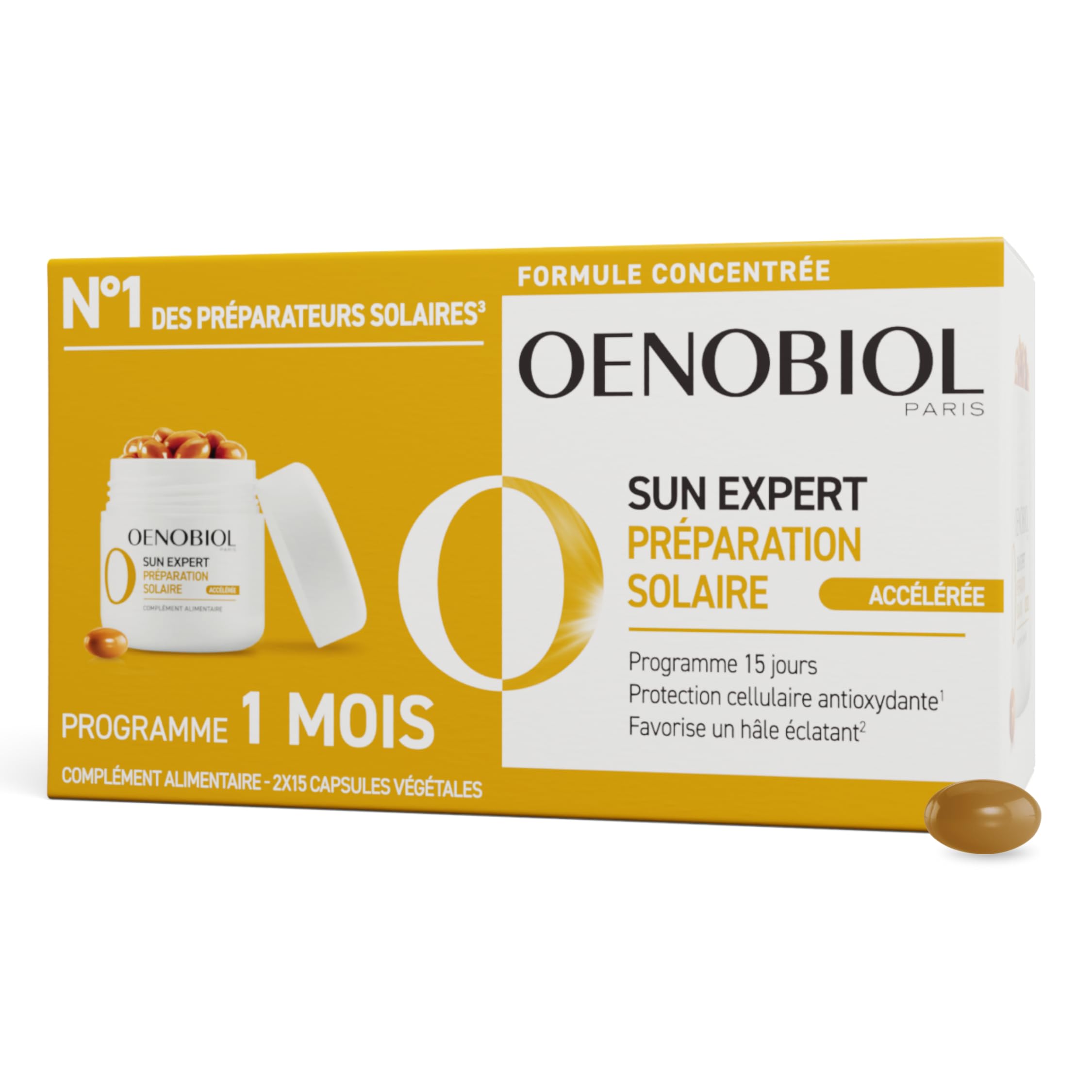 SUN EXPERT concentrates all its effectiveness in a short 15-day program to prepare the skin for sun exposure, preserve its beauty, and enhance your tan. At the heart of its highly concentrated formula, OENOBIOL incorporates the innovative Nutroxsun plant complex, rich in natural polyphenols, clinically tested, combined with selenium, zinc, and naturally sourced vitamin E, known for their protective properties against oxidative stress. Copper is a precursor to melanin, the biological pigment responsible for skin color. Copper promotes normal skin pigmentation. Supplemented with beneficial antioxidants, the skin is perfectly prepared for the sun to reveal a sublime and radiant tan, while being protected from the visible signs of aging. A supercharged formula with antioxidant efficacy: Nutroxsun, an innovative plant complex rich in polyphenols, is a combination of grapefruit and Mediterranean rosemary extract that prepares the skin in just 15 days and preserves its elasticity and evenness. Lycopene and lutein, plant-based carotenoids, along with selenium, plant-based vitamin E, and zinc, protect cells against oxidative stress. Copper, an essential trace element, contributes to normal skin pigmentation. 87 of the active ingredients are plant-based. This formula is suitable for vegetarians, and the vegetable capsule is derived from peas. It contains natural colorants and offers optimal tolerance. The formula is allergen-free, lactose-free, GMO-free, and beta-carotene-free. The packaging is 100 recyclable, printed with vegetable-based inks and water-based varnishes, and the paper comes from sustainably managed forests. INGREDIENTS INGREDIENTS: Emulsifier: sunflower oil, vegetable capsule (hydroxypropyl starch, carrageenan), tomato extract (Lycopersicon esculentum Mill.), NutroxSun (Rosmarinus officinalis L. and Citrus paradisi Macfad.), coating agent: glycerol, emulsifier: glyceryl monostearate, selenium-enriched yeast, D-alpha-tocopherol, marigold extract (Tagetes erecta L.), coating agent (sorbitol), zinc bisglycinate, color (riboflavins), copper bisglycinate. DIRECTIONS Take 1 capsule daily, starting 15 days before sun exposure. Continue taking 1 capsule daily during your vacation to prolong the benefits. Does not protect against sunburn. Appropriate sun protection for your skin type remains essential. SAFETY WARNING Food supplements should be used as part of a varied and balanced diet and a healthy lifestyle. For adult use only. Keep out of reach of children. People under medical supervision, pregnant women, or breastfeeding women should consult their doctor before taking a food supplement. Do not exceed the stated daily dose. See moreRESULTS: Enriched with beneficial antioxidants, the skin is perfectly prepared for the sun to reveal a sublime and radiant tan, while being protected from the visible signs of aging. Awarded the Victoires de la Beauté (Beauty Awards). SUN EXPERT Accelerated Sun Preparation concentrates all its effectiveness in a short 15-day program to prepare the skin for sun exposure, preserve its beauty, and enhance the tan.Sun Expert préparation solaire accélérée 2x15 capsules 1 unité (Lot de 1)DESCRIPTION DU PRODUIT DESCRIPTION DU PRODUIT SUN EXPERT concentre toute son efficacité dans un programme court en 15 jours seulement pour préparer la peau à l'exposition solaire, préserver sa beauté et sublimer le bronzage. Au cœur de sa formule hautement concentrée, OENOBIOL intègre le complexe végétal innovant Nutroxsun, riche en polyphénols naturels, testé cliniquement associé au sélénium, au zinc et à la vitamine E d'origine naturelle connus pour leurs vertus protectrices contre le stress oxydatif. Le cuivre est précurseur de mélanine, pigment biologique responsable de coloration de la peau. Le cuivre favorise une pigmentation normale de la peau. Supplémentée en antioxydants bienfaiteurs, la peau est parfaitement préparée au soleil pour révéler un bronzage sublime et éclatant, tout en étant préservée des signes visibles du vieillissement. Une formule suractivée à l'efficacité antioxydante : Nutroxsun, complexe végétal innovant, riche en polyphénols, est une combinaison de pamplemousse et d'un extrait de romarin méditerranéen qui permet de préparer la peau en seulement 15 jours et de préserver son élasticité et son uniformité. Lycopène et Lutéine, caroténoïdes d'origine végétale Sélénium, Vitamine E d'origine végétale et Zinc protègent les cellules contre le stress oxydatif. Cuivre, oligo-élément essentiel, contribue à une pigmentation normale de la peau. 87 des ingrédients actifs sont d'origine végétale Formule qui convient aux végétariens, capsule végétale issue du petit pois. Des colorants d'origine naturelle Une formule à la tolérance optimale sans allergène, sans lactose, sans OGM, sans bétacarotène Des étuis 100 recyclables imprimés avec des encres végétales, des vernis sur base eau et dont le papier est issu de forêts durablement gérées. INGRÉDIENTS INGRÉDIENTS : Emulsifiant : huile de tournesol, capsule végétale (amidon hydroxypropylé, carraghénanes), extrait de tomate (Lycopersicon esculentum Mill.), NutroxSun (Rosmarinus officinalis L. et Citrus paradisi Macfad.), agent d'enrobage : glycérol, émulsifiant : monostéarate de glycérol, levure enrichie en sélénium, D-alpha-tocophérol, extrait de tagète (Tagetes erecta L.), agent d'enrobage (sorbitol), bisglycinate de zinc, colorant (riboflavines), bisglycinate de cuivre. MODE D'EMPLOI 1 capsule par jour, 15 jours avant l'exposition solaire. Continuez la prise d'1 capsule par jour pendant vos vacances pour prolonger les bénéfices. Ne protège pas des coups de soleil. Une protection solaire adaptée au type de peau reste indispensable. AVERTISSEMENT DE SÉCURITÉ Les compléments alimentaires doivent être utilisés dans le cadre d'une alimentation variée, équilibrée et d'un mode de vie sain. Réservé à l'adulte, tenir hors d