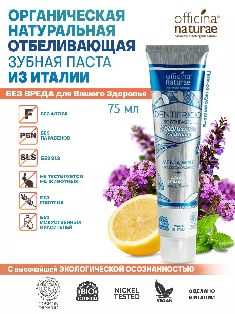 Отбеливающая зубная паста Officina Naturae 75 мл. - 100% натуральная зубная паста без фтора, созданная в Италии с сертификатами INCI и COSMOS. Ее уникальный состав обеспечивает отбеливание эмали благодаря экстрактам шалфея и лимона, а также защиту от налета и кариеса с помощью исландского лишайника и цитрата цинка. Экстракты тимьяна, одуванчика и розмарина добавлены для снятия воспалений. Особенность этой пасты заключается в ее экологичности. Она не содержит фтора, парабенов, SLS, SLES и других потенциально вредных добавок. Упаковка пасты полностью перерабатываемая, с алюминиевым тюбиком и биопластиковой крышкой. Среди активных компонентов этой отбеливающей пасты есть исландский лишайник, который предотвращает образование налета, а также цитрат цинка для дополнительной защиты. Экстракты одуванчика, тимьяна, шалфея и розмарина обладают различными полезными свойствами для здоровья десен и зубов. Эта отбеливающая паста для зубов не только ухаживает за состоянием полости рта, но и способствует экологической ответственности, учитывая природу и окружающую среду. Натуральная зубная паста Officina Naturae - это итальянская органическая зубная паста без фтора, созданная специально для взрослых. Ее отбеливающие свойства помогут вам достичь более белоснежной улыбки, а натуральный состав обеспечит здоровье ваших зубов и десен. Выбирайте отбеливающую зубную пасту от кариеса Officina Naturae для природного и эффективного ухода за вашей улыбкой.