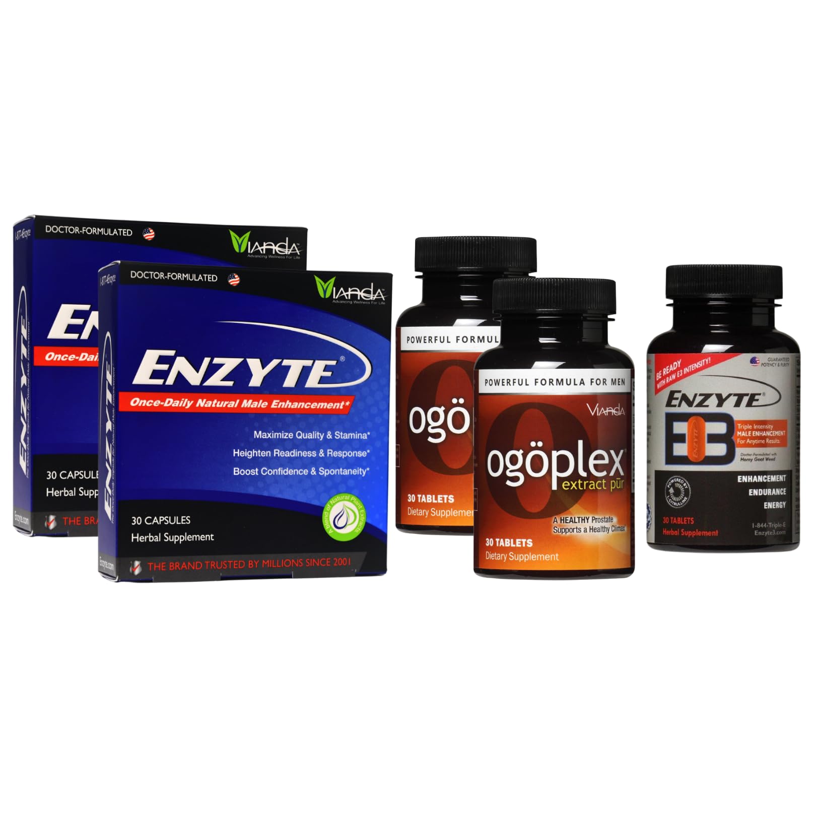 Enzyte's doctor-formulated proprietary blend contains potent natural ingredients designed to deliver a powerful boost of blood flow for natural male enhancement. Enzyte boasts a gluten-free, non-GMO, soy free, and dairy free formulation. A healthy prostate for a hearty climax with doctor-formulated Ogoplex. Ogoplex is a natural men's supplement formulated with Patented Graminex Swedish flower pollen, saw palmetto, phytosterols, and lycopene to support prostate health and urinary function to deliver a deep, powerful climax. Ogoplex is trusted by millions of men worldwide to help deliver a more enjoyable male sexual experience. Taken daily, Ogoplex may help you: support prostate health for a hearty climax enhance sexual capacity for a robust sexual experience maintain urinary function and male reproductive health regain confidence in your masculinity. Enzyte3 is crafted with L-Citrulline, Epimedium, Guarana Seed Extract, Horny Goat Weed. This triple intensity blend surpasses the competition, offering a trifecta of benefits: enhancement, endurance, and energy.Taken daily to support powerful male enhancement, Enzyte3 is designed to give you a surge of intensity, endurance, and energy for the pleasure you deserve when and where you need it. All products can be taken together for powerful male experience. Enzyte3 is: Dairy Free, Gluten Free, Soy Free, Vegetarian, Free of Non-GMO's. NATURAL - Enzyte is Non-GMO, Gluten-Free, and Tested for Potency. NATURAL - Third Party Tested for Potency. Unlike other single ingredient formulas, Enzyte's carefully crafted blend doctor-formulated to specifically address decline and uses only the best ingredients at clinically relevant doses. Ogoplex is Non-GMO Formula is Vegetarian, Vegan, Gluten-Free, Dairy-Free, and Kosher. Manufactured in the U.S.A. in FDA-Audited GMP Laboratories with Clinically-Studied Ingredients. Ogoplex is made with Patented Graminex "Swedish" Flower Pollen is a powerful upgrade to our previous formula generic Swedish Flower Pollen, supports prostate health by increg peak urine flow and enhancing muscle tone. The Plant Phytosterols in Ogoplex are thought to support the body's defense systems. Studies suggest plant phytosterols can help improve the overall quality of life for men with prostate issues. Saw Palmetto to help alleviate the symptoms of prostate problems. CAREFULLY CRAFTED POTENT – Enzyte's formula was developed by industry experts to specifically address men's health associated with age. The capsule has allowed Enzyte to streamline its blend and increase the dosages of the most potent proven ingredients delivering an effective formulation of ingredients chosen for their synergistic properties. THE PERFECT MALE BUNDLE - Taken daily, the ingredients in Enzyte work with your body chemistry for results that intensify over time, giving you unprecedented confidence in your ability to perform. The longer you take Enzyte, the longer your powerful benefits will last. That means you'll be up for the challenge whenever the opportunity arises. Ogoplex is Doctor-Formulated Prostate Support, Enhance Sexual Wellness, Maintain Urinary Function and Male Reproductive Health.