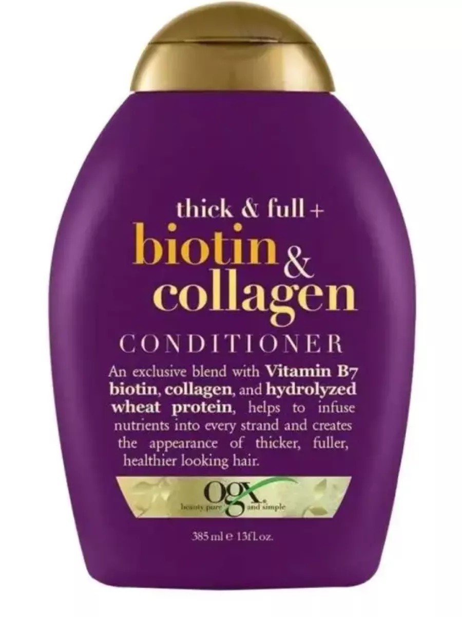 OGX Conditioner for Flat and Fine Hair with Biotin and Collagen, 385g. This conditioner for flat hair strengthens and repairs damaged and fine hair, reducing breakage and making it thicker and healthier. This nutrient-rich, volumizing formula, infused with vitamin B7, biotin, collagen, and wheat protein, promotes hair growth and adds natural shine. This pH-neutral conditioner promotes smoothness and frizz-free hair. This paraben- and sulfate-free moisturizing conditioner offers complete hair care and imparts an unforgettable scent of jasmine with notes of vanilla and bergamot. For best results, use this conditioner with the shampoo for flat and fine hair with biotin and collagen from this line. Ingredients: aqua/water/eau, cetearyl alcohol, glycerin, cetyl alcohol, behentrimonium chloride, dimethicone, biotin, hydrolyzed collagen, hydrolyzed wheat protein, ethyltrimonium chloride methacrylate/hydrolyzed wheat protein copolymer, panthenol, ethyl trisiloxane, glycol distearate, glycol stearate, ceteareth-20, isopropyl alcohol, citric acid, disodium edta, tetrasodium edta, phenoxyethanol, ethylhexylglycerin, parfum/fragrance, hexyl cinnamal, ci 60730/ext. violet 2, ci 17200/red 33