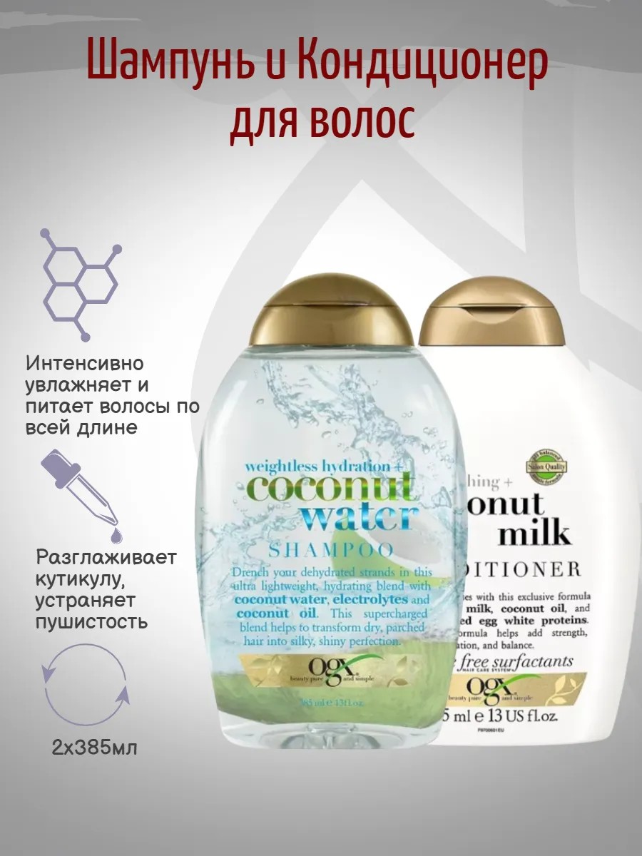 | Комплектация | OGX Шампунь с кокосовой водой,Кондиционер с кокосовым молоком 2x385мл |
