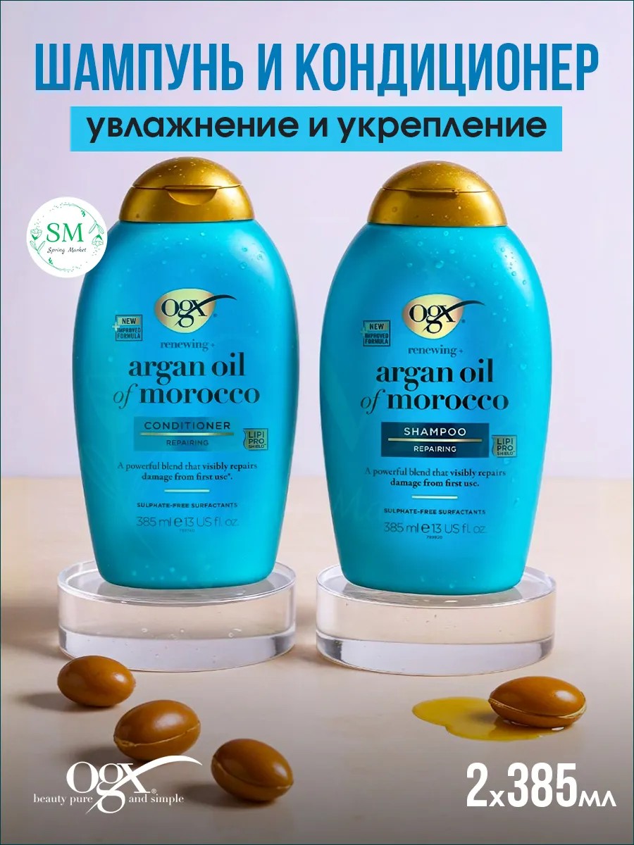 OGX Argan Oil of Morocco — шампунь и кондиционер для восстановления и глубокого увлажнения. Содержат аргановое масло, аминокислоты шёлка и протеины. Без сульфатов и парабенов. Для сухих, повреждённых и окрашенных волос. Объём: 2×385 мл.