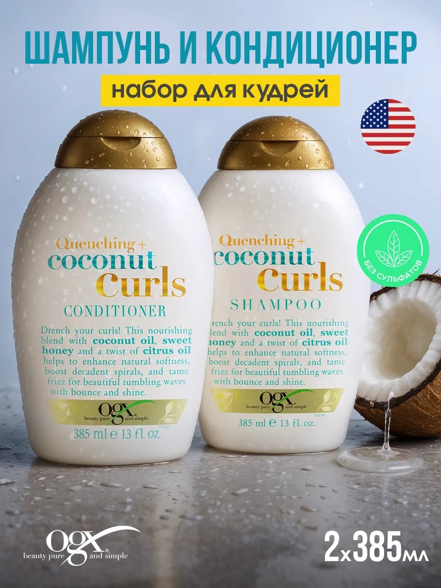 OGX Coconut Curls — набор шампунь и кондиционер с кокосовым маслом, мёдом и цитрусом. Подчёркивает завиток, увлажняет и придаёт блеск. Для кудрей, без сульфатов и силиконов. Объём: 385 мл × 2.