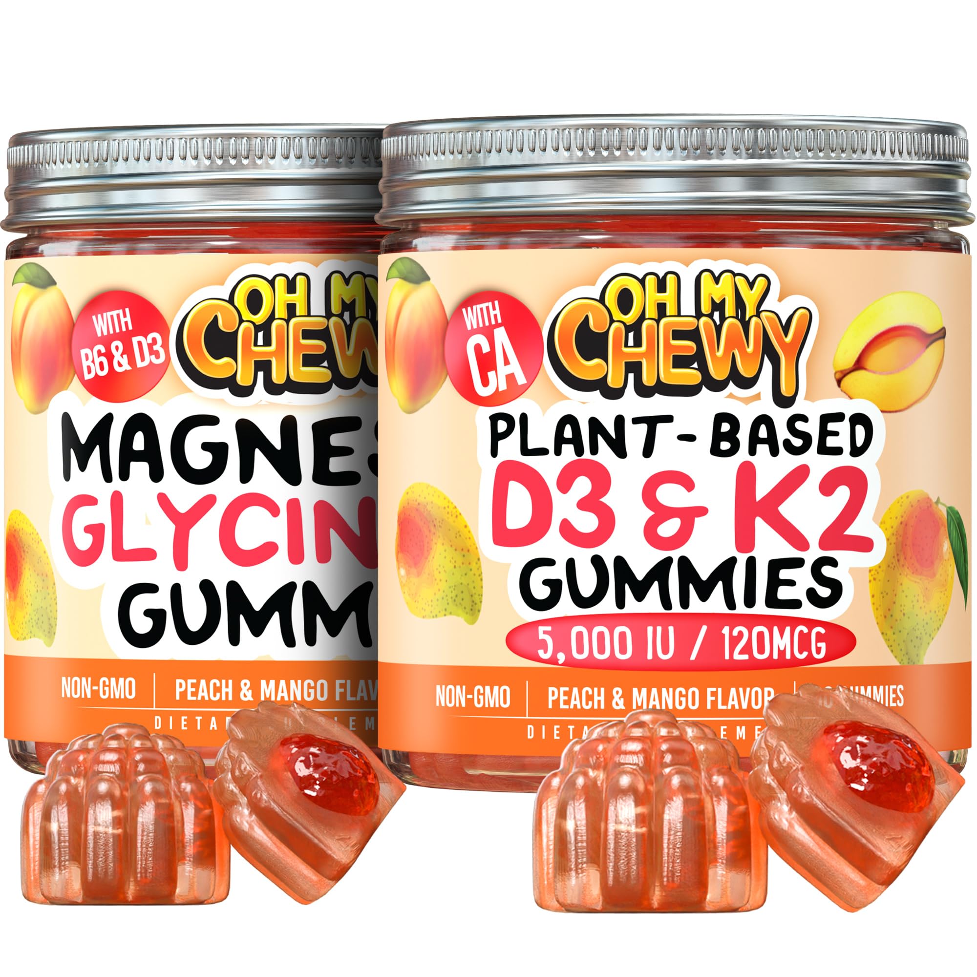 OH MY CHEWY Magnesium + D3K2 Gummies Bundle 2 Bottles (60 Each) Peach Mango
