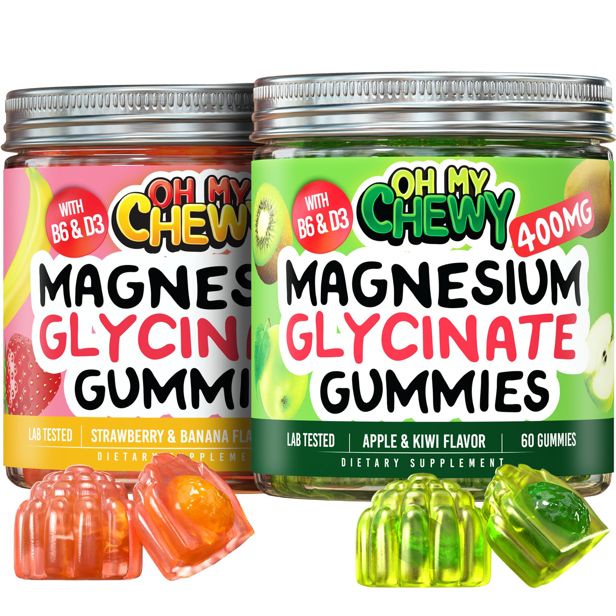 OH MY CHEWY Magnesium Gummies Bundle 2 Bottles (60 Each) Strawberry Banana & Apple Kiwi