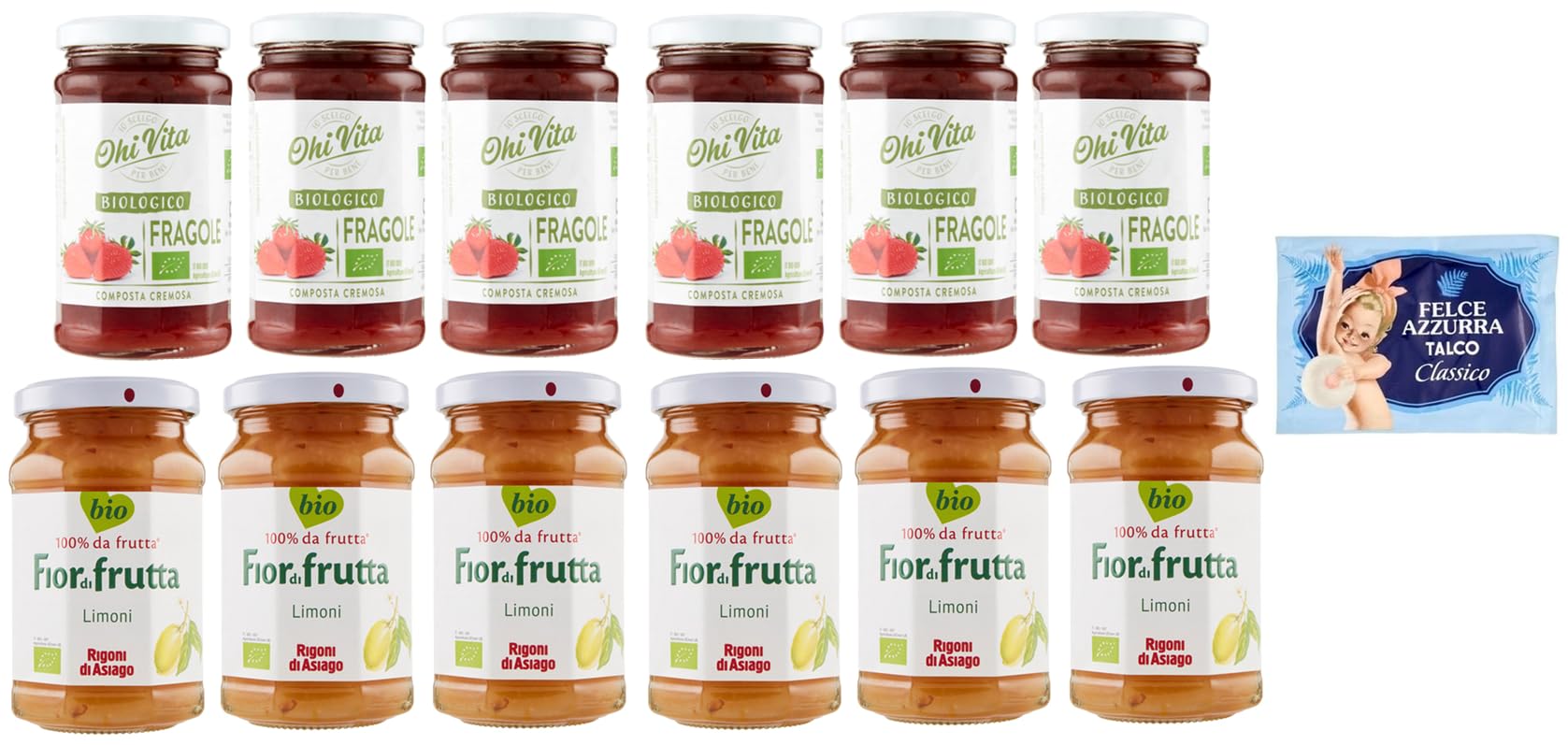 1 free pack of Felce Azzurra talcum powder, 100g bag of Ohi Vita jam, Fragole, creamy strawberry compote, fruit compote, 250g glass creamy and with a fragrant and aromatic sweetness, organic strawberry compote is a real concentrate of well-being, especially thanks to its antioxidants such as flavonoids and vitamin C. It is the ideal fruit, the strawberry: due to its color, its shape, its sweet and intense taste and its nutritional properties, it convinces everyone, adults and children. Pack of 6 jars of Rigoni di Asiago Limoni jam - Creamy lemon compote - Fruit compote - 250g - In glass - Made from lemons harvested mainly in the southern regions of Sicily. Citrus fruit with precious properties, rich in citric acid, potassium and sodium. Taste: typically sour. Pairings and tips: Pairs perfectly with whole-wheat cream cheese, gorgonzola, and herb tortelli. Also ideal for filling tarts and other desserts.Rigoni di Asiago Set of 6 Limoni Jam Jars - Creamy Lemon Compote - Fruit Compote - 250 g. Ohi Vita Pack of 6 Fragole Jam, Creamy Strawberry Compote, Fruit Compote, 250 g. 1 packet of Felce Azzurra talcum powder - 100 g sachet. 1 paquet de poudre de talc Felce Azzurra gratuite, sachet de 100 g de confiture Ohi Vita, Fragole, compote de fraises crémeuse, compote de fruits, 250 g de verre crémeuse et avec une douceur parfumée et aromatique, la compote de fraises bio est un véritable concentré de bien-être, surtout grâce à ses antioxydants tels que les flavonoïdes et la vitamine C. C'est le fruit idéal, la fraise : par sa couleur, sa forme, son goût sucré et intense et ses propriétés nutritionnelles, elle convainc tous, adultes et enfants. Lot de 6 pots de confiture Rigoni di Asiago Limoni - Compote de citron crémeuse - Compote de fruits - 250 g - En verre - Fabriqué à partir de citrons récoltés principalement dans les régions du sud de la Sicile. Agrumes aux propriétés précieuses, riches en acide citrique, potassium et sodium. Goût : typiquement aigre. Combinaisons et conseils : s'accorde parfaitement avec le fromage frais complet, le gorgonzola et le tortelli aux herbes. Idéal également pour remplir des tartes et autres desserts.Rigoni di Asiago Lot de 6 pots de confiture Limoni - Compote de citron crémeuse - Compote de fruits - 250 g. Ohi Vita Lot de 6 pots de confiture Fragole, compote de fraises crémeuse, compote de fruits, 250 g. 1 paquet de poudre de talc Felce Azzurra - Sachet de 100 g.