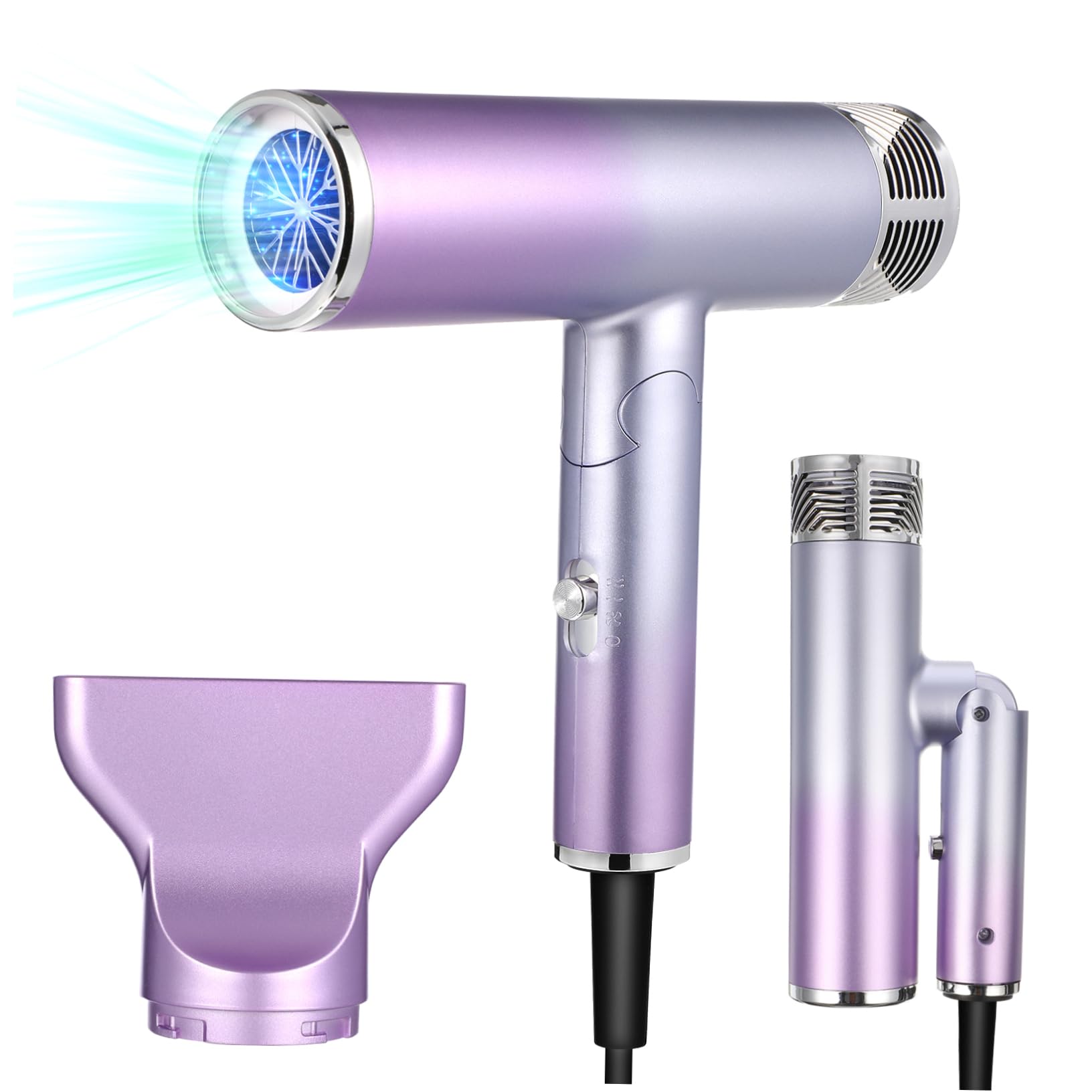 Package List 1 x hair dryer 1 x instruction manual 1 x air nozzle Characteristics - Quick drying: This hair dryer can quickly dry your hair without hurting hair much, saving your time and reliable to use travel hairdryer. -Speed: 110000RPM hair dryer - Hair care: This hair dryer has an intelligent temperature control, which is easy to adjust, providing effective protection small travel blow dryer. -Size:22.50X20.50X5.00cm 8.84X8.06X1.97in small blow dryer - Home salon: With this hair dryer, you can get a natural curly hair or other beautiful hair styles at home, bringing much comfort travel hair bonnet dryer. -Rated power: 1200W small travel hair dryer -Color:Gradient purple mini hair dryer for travel -Rated voltage: 110V small hair dryer -Wind speed: 20m s travel hair dryer - Lightweight and compact: This small hair dryer is suitable for travel use, and its lightweight brings less burden when you are using it hair dryer foldable. -Material:ABS travel blow dryer -Noise: 76.1DB travel diffuser hair dryer -Size:8.50X7.50X4.70cm 3.34X2.95X1.85in folding hair dryer -Size:160.00X4.30X3.50cm 62.88X1.69X1.38in small hairdryer Goods Information small blow dryer This portable hair dryer is space-saving and practical, can be folded in to a compact size, making it convenient to store or carry.travel hair bonnet dryer With its powerful drying technology, this hair dryer can quickly dry your hair without damage hair much.diffuser hair dryer Note: This item comes with US plug, please confirm the voltage of your area before purchg.small travel hair dryer The adjustable temperature control can better suit your needsHair dryer foldable-- stylish and beautiful: this gradient color and sleek appearance of this hair dryer is pretty stylish, making it a great addition in your bathroom,travel diffuser hair dryer. Foldable blow dryer-- lightweight and compact: this small hair dryer is suitable for travel use, and its lightweight brings less burden when you are using it,travel hair bonnet dryer. Folding hair dryer-- hair care: this hair dryer has an intelligent temperature control, which is easy to adjust, providing effective protection,mini hair dryer for travel. Small hairdryer-- quick drying: this hair dryer can quickly dry your hair without hurting hair much, saving your time and reliable to use,travel blow dryer. Small travel blow dryer-- home salon: with this hair dryer, you can get a natural curly hair or other beautiful hair styles at home, bringing much comfort,travel hairdryer.