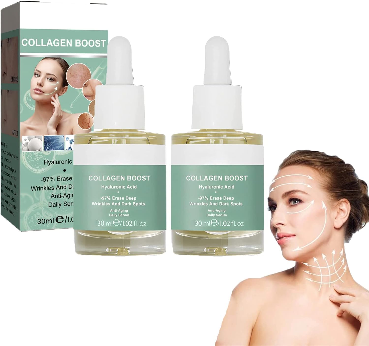 Feature: 1.Reduce appearance of fine lines and wrinkles. 2.Repairing and moisturizing at the same time. 3.Can be fully absorbed by the skin. 4.Scientifically smoother and tighter skin. 5.Suitable for every skin type. Specification: 100 brand new and high quality! Name: Collagen Boost Anti Aging Serum Net Content: 30ml Note: 1.Due to manual measurement, please allow an error of 1-2cm, please make sure you don't mind before ordering. 2.Due to the difference of different monitors, the picture may not reflect the actual color of the item. Package includes: 2pcs x Collagen Boost Anti Aging SerumAnti-Aging Collagen Serum --- Locks in moisture, stimulates collagen production, erase wrinkles, brightens Skin, and repairs damage making it the ultimate Collagen Boost Anti-aging Serum. Energizes Skin --- Advanced Collagen Boost Anti Aging Serum Lightens and brightens uneven skin tones for fairer skin with a radiant glow. blemish skin corrector serum Luxury Rejuvenates skin, improves skin elasticity, restores even and translucent skin texture, moisturizes, is non-sticky and absorbs quickly. Provide an Instant Blemish Free Skin --- Advanced Collagen Boost Anti Aging Serum is a Miracle Correcting Serum That is Specially Formulated to Provide an Instant Blemish Free Skin. Suitable for All Skin Types --- Advanced Collagen Boost Anti Aging Serum is suitable for any skin, dehydrated or dry skin, dull skin, oily skin and acne prone, aging wrinkle skin. Refreshing effect that allows the essence to melt into the skin quickly. Collagen Protein Complex Essence Skin Elasticity and Luster. Enrich in Collagen Essence --- Advanced Collagen Boost Anti Aging Serum Combines naturally extracted sheep placenta with collagen, amino acids and amino acids to produce a powerful anti-aging effect, smooth penetration into the skin, improve sagging, sagging and wrinkle problems and brighten the skin.2PCS Advanced Collagen Boost Anti Aging Serum, Skincare Glow And Protect Serum, Collagen Peptide Serum for Face Wrinkles, Collagen Boost Anti Aging Serum Feature: 1.Reduce appearance of fine lines and wrinkles. 2.Repairing and moisturizing at the same time. 3.Can be fully absorbed by the skin. 4.Scientifically smoother and tighter skin. 5.Suitable for every skin type. Specification: 100 brand new and high quality! Name: Collagen Boost Anti Aging Serum Net Content: 30ml Note: 1.Due to manual measurement, please allow an error of 1-2cm, please make sure you don't mind before ordering. 2.Due to the difference of different monitors, the picture may not reflect the actual color of the item. Package includes: 2pcs x Collagen Boost Anti Aging SerumAnti-Aging Collagen Serum --- Locks in moisture, stimulates collagen production, erase wrinkles, brightens Skin, and repairs damage making it the ultimate Collagen Boost Anti-aging Serum. Energizes Skin --- Advanced Collagen Boost Anti Aging Serum Lightens and brightens uneven skin tones for fairer skin with a radiant glow. blemish skin corrector serum Luxury Rejuvenates skin, improves skin elasticity, restores even and translucent skin texture, moisturizes, is non-sticky and absorbs quickly. Provide an Instant Blemish Free Skin --- Advanced Collagen Boost Anti Aging Serum is a Miracle Correcting Serum That is Specially Formulated to Provide an Instant Blemish Free Skin. Suitable for All Skin Types --- Advanced Collagen Boost Anti Aging Serum is suitable for any skin, dehydrated or dry skin, dull skin, oily skin and acne prone, aging wrinkle skin. Refreshing effect that allows the essence to melt into the skin quickly. Collagen Protein Complex Essence Skin Elasticity and Luster. Enrich in Collagen Essence --- Advanced Collagen Boost Anti Aging Serum Combines naturally extracted sheep placenta with collagen, amino acids and amino acids to produce a powerful anti-aging effect, smooth penetration into the skin, improve sagging, sagging and wrinkle problems and brighten the skin.