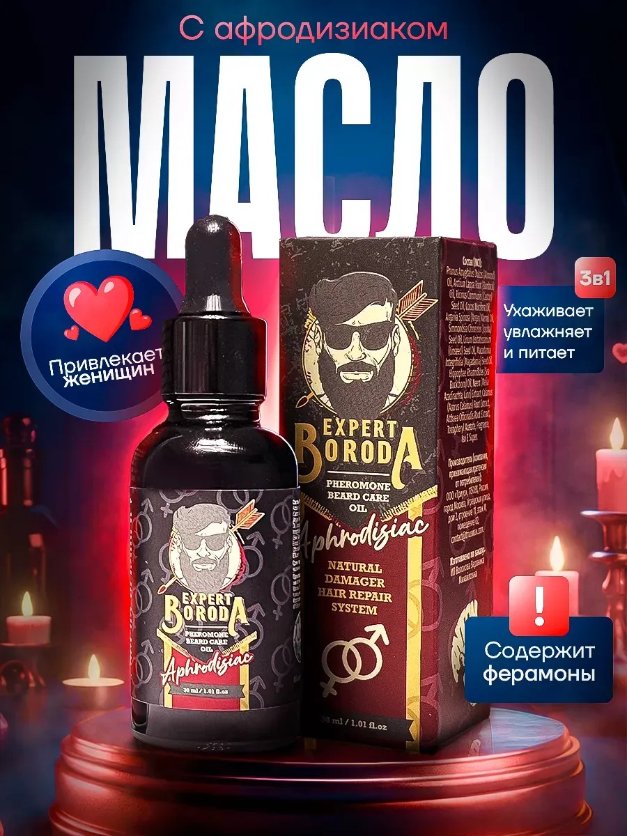 Aphrodisiac EXPERT BEARD GROWTH OIL is a natural complex with PHEROMONES and a luxurious perfume composition for effective care of the beard and the skin beneath it. The stimulating and captivating aroma of the oil will boost your confidence and attractiveness – you'll definitely attract women's attention. According to experts, this perfume composition is as close as possible to the natural aura of a person and contains long-lasting pheromones that attract with their natural properties. Nine valuable oils, three plant extracts, and vitamin E deeply moisturize, soften, and nourish the beard and the skin beneath it, preventing itching and flaking, eliminating breakage and split ends. With regular use, the oil significantly facilitates combing and styling, helps maintain a neat contour and a well-groomed appearance, making wearing Borda even more comfortable day after day. The natural ingredients in this product stimulate hair follicles and nourish them with vitamins and minerals for the growth of a strong, elastic, and thick beard. It makes a great gift for New Year's and birthdays. EXPERT BEARD oil is an effective activator for beard and hair growth, as it contains premium softening and moisturizing ingredients that not only help thicken but also improve the overall condition of hair and facial skin. This beard care product is designed for a healthy beard. Regular use will help accelerate restoration and prevent hair loss, and has a strong cumulative effect. EXPERT BEARD oil is HALAL-certified, ensuring its safety and quality. It does not contain any hormonal additives or medications. Directions: Apply a few drops of oil to a clean beard using a pipette. Using combing movements, thoroughly distribute the product, first from the bottom up, then from the top down, giving it shape.