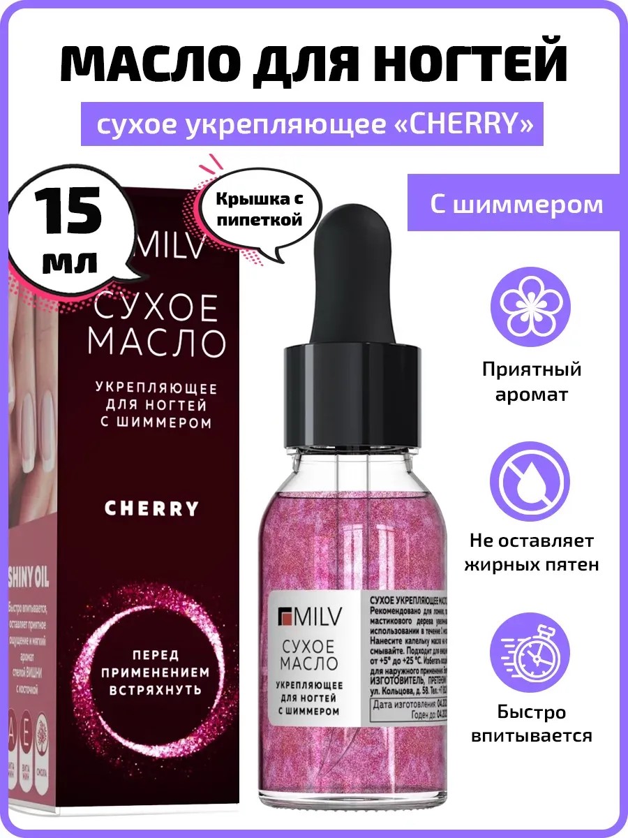 | Комплектация | Флакон - 1 шт; Сухое масло для кутикулы и ногтей с шиммером 'Cherry' 15мл |