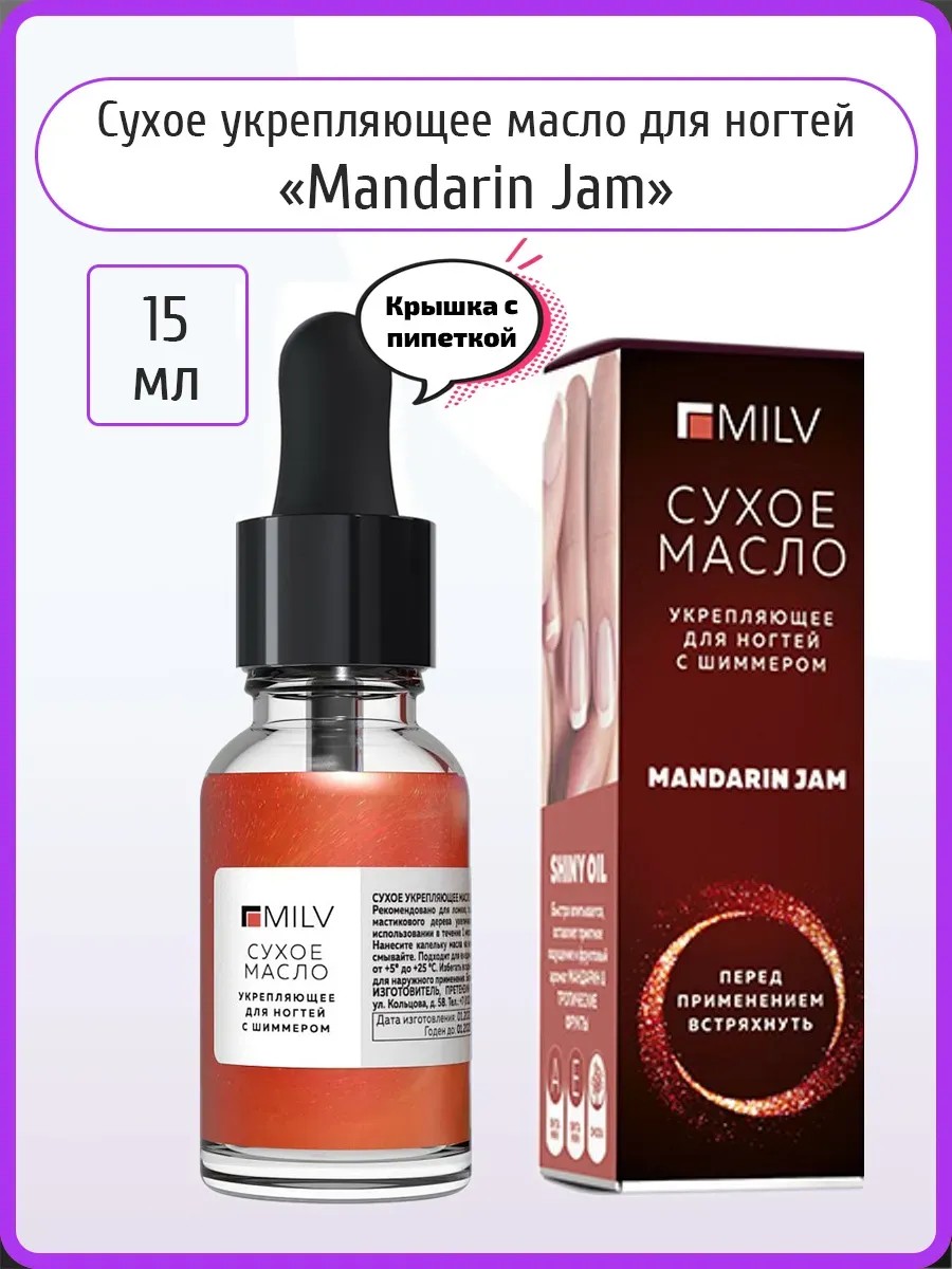| Комплектация | Флакон 15 мл - 1 шт; Сухое укрепляющее масло для ногтей с шиммером Mandarin 15 мл; Сухое масло для ногтей и кутикулы 'Mandarin jam' |