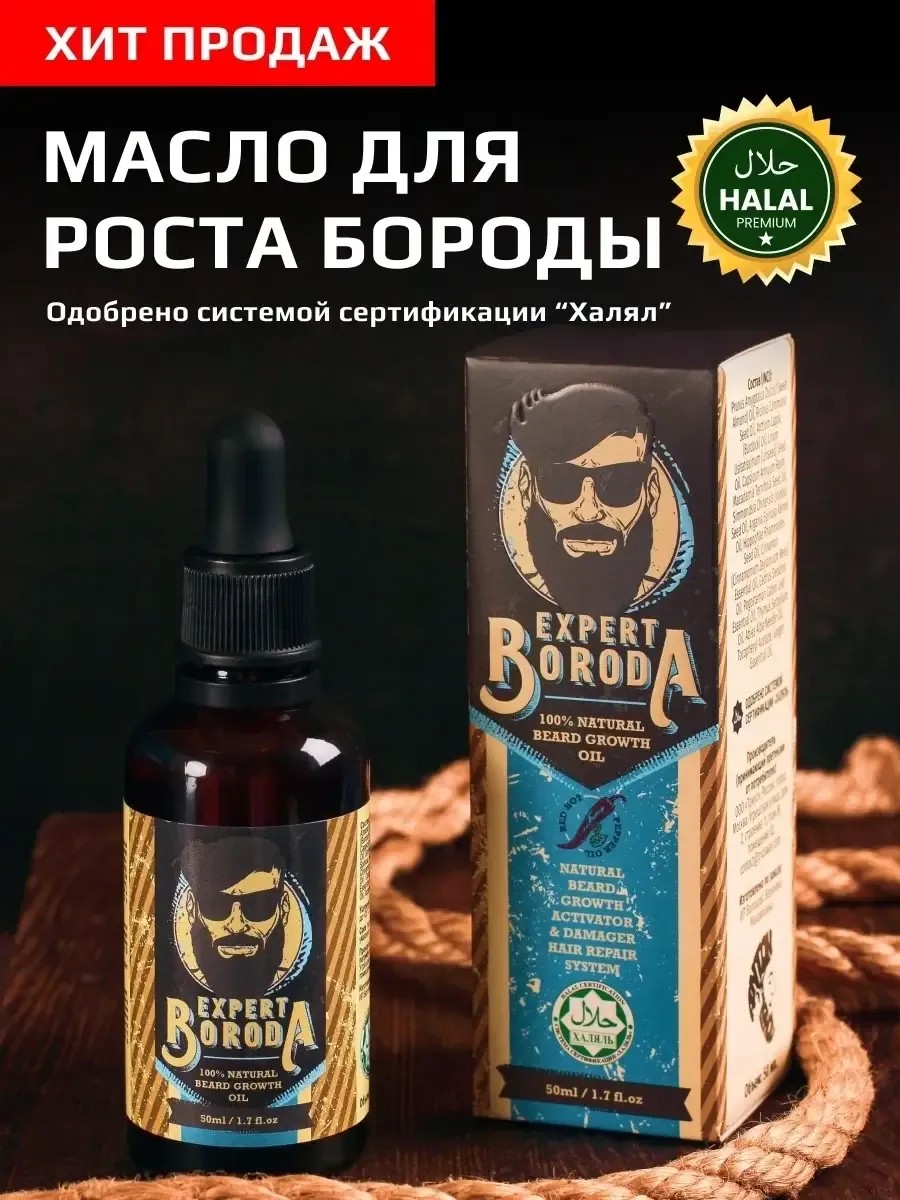 BEARD GROWTH OIL "EXPERT BORODA" is an effective natural complex based on organic oils and extracts for increasing beard thickness. "EXPERT BORODA" beard growth oil is approved by the HALAL certification system, which attests to the safety and quality of the product. Beard growth oil accelerates growth due to the body's natural resources. "EXPERT BORODA" oil does not contain any hormonal additives or drugs. The product is based on red hot pepper and a vitamin complex of natural oils. Thanks to the content of red pepper oil, the product has a warming effect to stimulate the activity of hair follicles. The composition of natural oils, extracts, and vitamins helps increase hair density and elasticity. Important! Beard oil will only promote hair growth in areas where hair follicles are present. It stimulates even and rapid growth of existing facial hair. Contains natural oils.