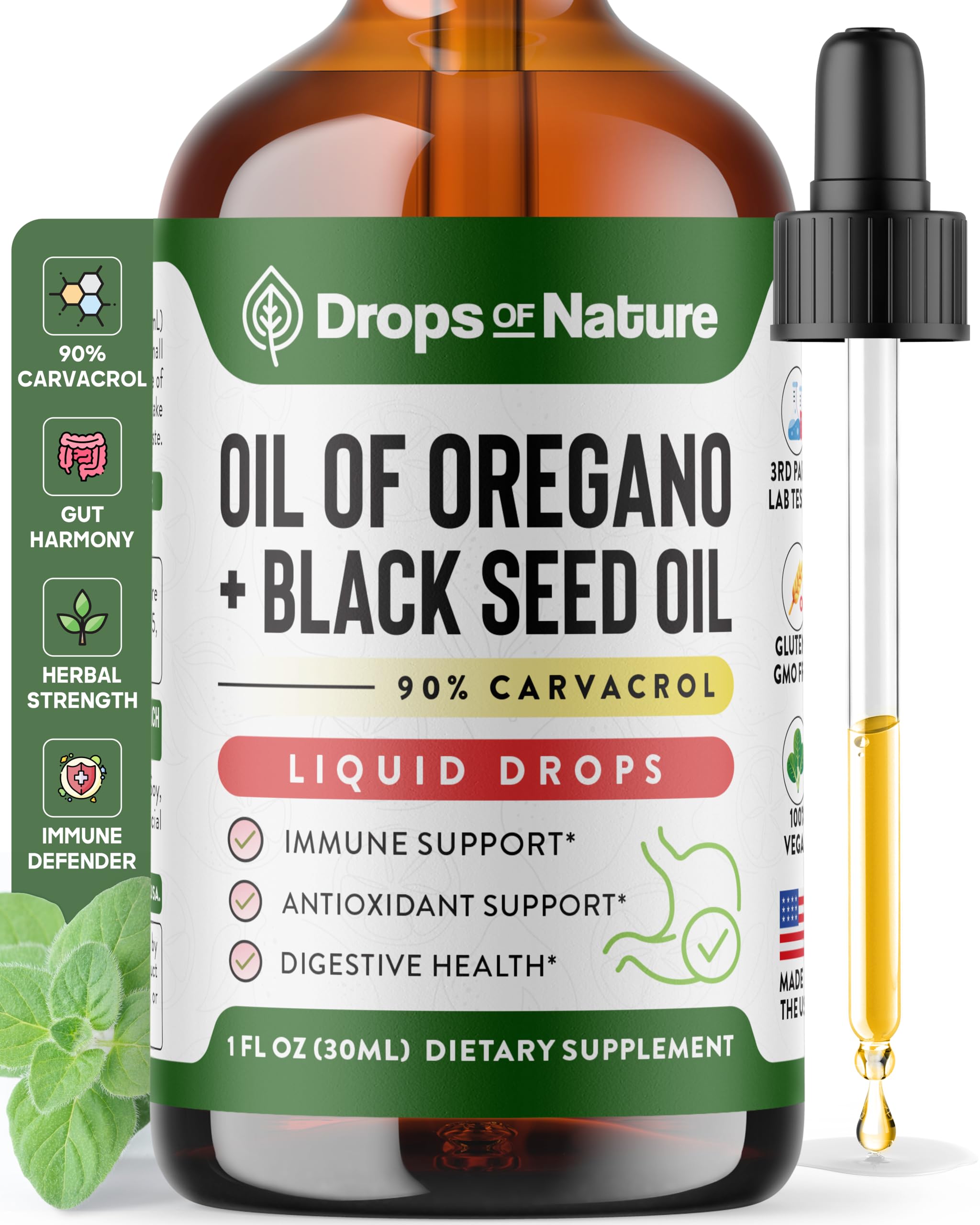 Oil of Oregano with Black Seed Oil Liquid Drops Wild Oregano (90% Carvacrol) and Black Cumin Seed Oil Vegan GMO-Free & High-Potency Supports Immunity Gut Health and Wellness (Unflavored 30mL)