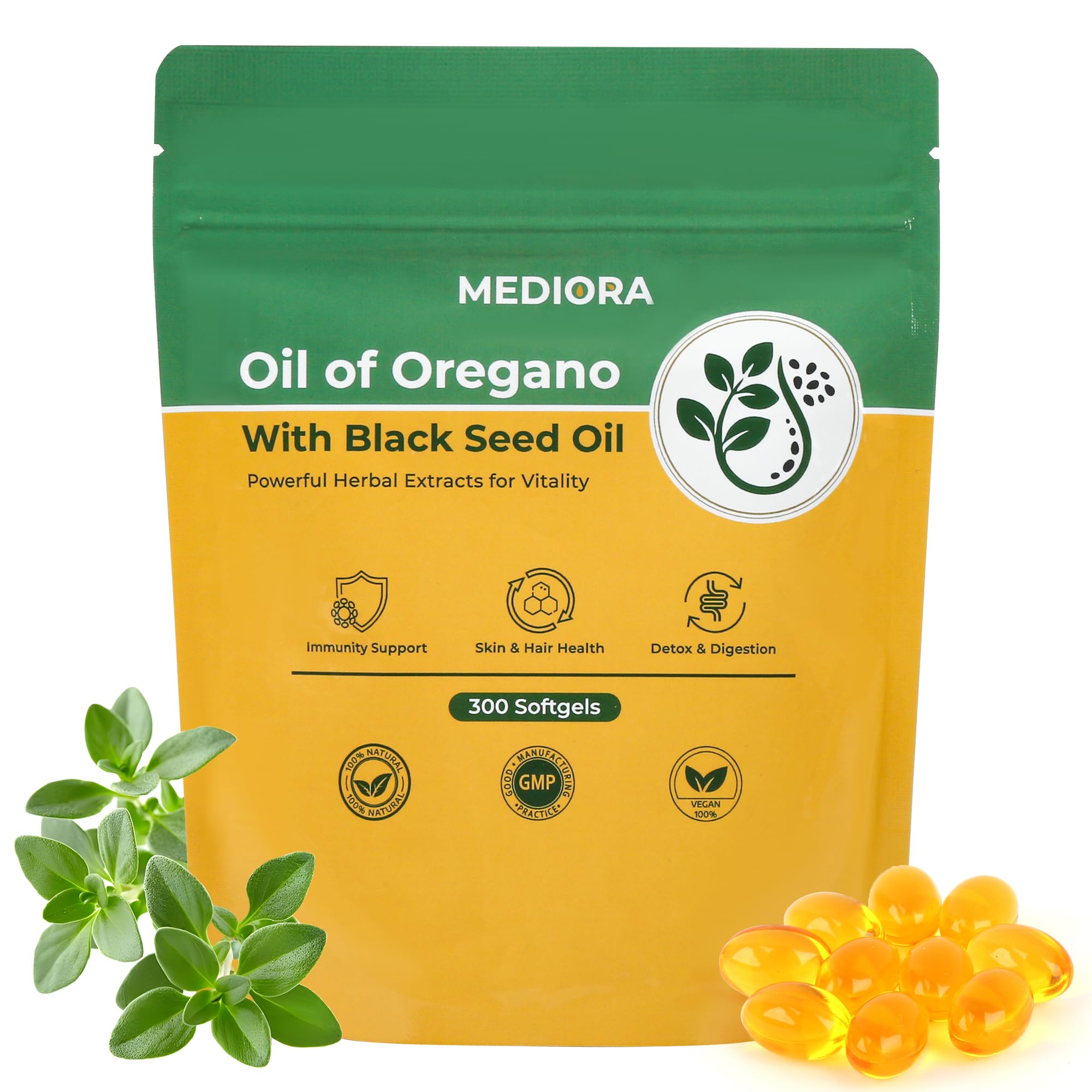 CLEAN TRUSTED QUALITY: High-quality oil of oregano and black seed oil capsules made non-GMO and free from soy, dairy, gluten, and fillers. Third-party lab tested for purity, safety, and potency. ENHANCED ABSORPTION SOFTGELS: Premium oregano oil black seed oil softgels are easy to swallow and designed for better absorption of fat-soluble nutrients, without the harsh taste of liquid oregano oil. RICH IN MULTIPLE NUTRIENTS: This black seed oil and oregano oil blend supports natural energy levels, skin appearance, and hair health using traditionally used plant-based oils for whole-body nourishment. RICH IN NATURAL ANTIOXIDANTS: Our organic oil of oregano with black seed oil is packed with carvacrol and thymoquinone to help combat oxidative stress while supporting immune, digestive, and seasonal health. POWERFUL 2-IN-1 FORMULA: Advanced oil of oregano with black seed oil delivers 300mg oregano oil and 200mg black seed oil per serving. Take 2 softgels daily for balanced wellness and daily nutritional support.