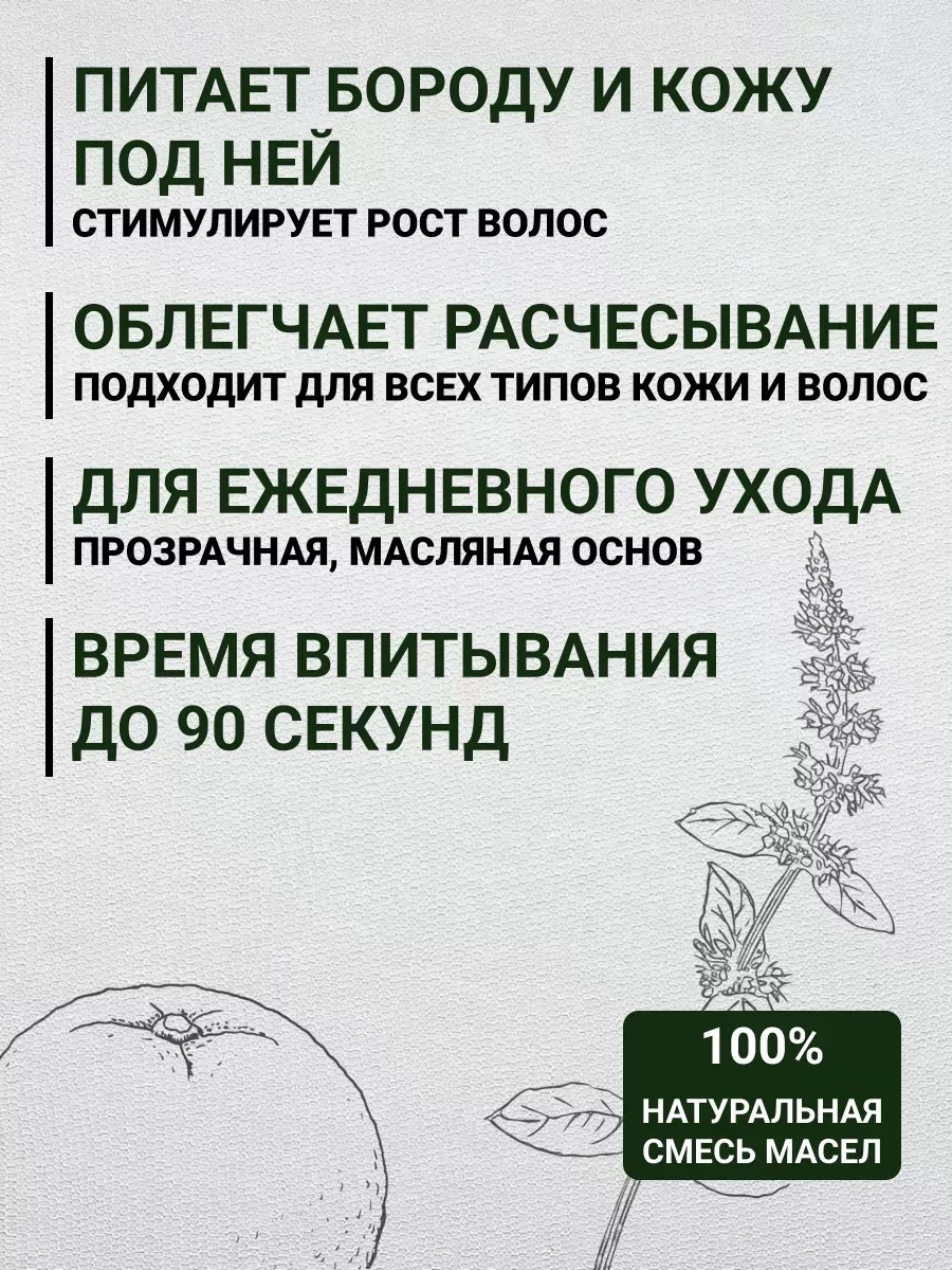 Уникальная смесь из 100% натуральных эфирных масел для питания вашей бороды и кожи лица. Содержит масла индийской перечной мяты, мандарина и чайного дерева. Нанесите на чистые, сухие волосы для придания мягкости и ухоженности вашей бороде. Оригинальная бутылочка с резиновой крышкой для точного дозирования.