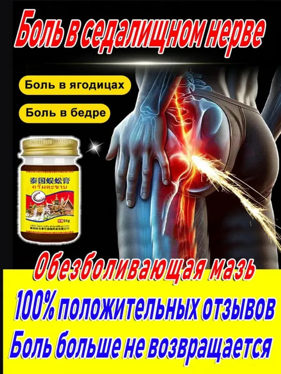 Мазь при защемлении седалищного нерва и болях в пояснице, 55 г Натуральное облегчение боли — без химии и побочных эффектов!Страдаете от боли в пояснице или защемления седалищного нерва? Попробуйте нашу эффективную мазь на основе традиционных китайских трав! Она разработана для глубокого проникновения в очаг боли, улучшения кровообращения и снятия воспаления. Почему выбирают нашу мазь: Быстро снимает боль и напряжение в пояснице Помогает при защемлении седалищного нерва и радикулите Натуральный состав — безопасно для длительного применения Удобная текстура — легко наносится и быстро впитывается Подходит для пожилых людей, офисных работников, водителей, спортсменов и всех, кто сталкивается с нагрузкой на спинуСостав: Экстракты жгучей редьки, шафрана, имбиря, корицы и других целебных растений восточной медицины. Совет по применению: Наносите 2–3 раза в день на проблемную зону, мягко массируя до полного впитывания.