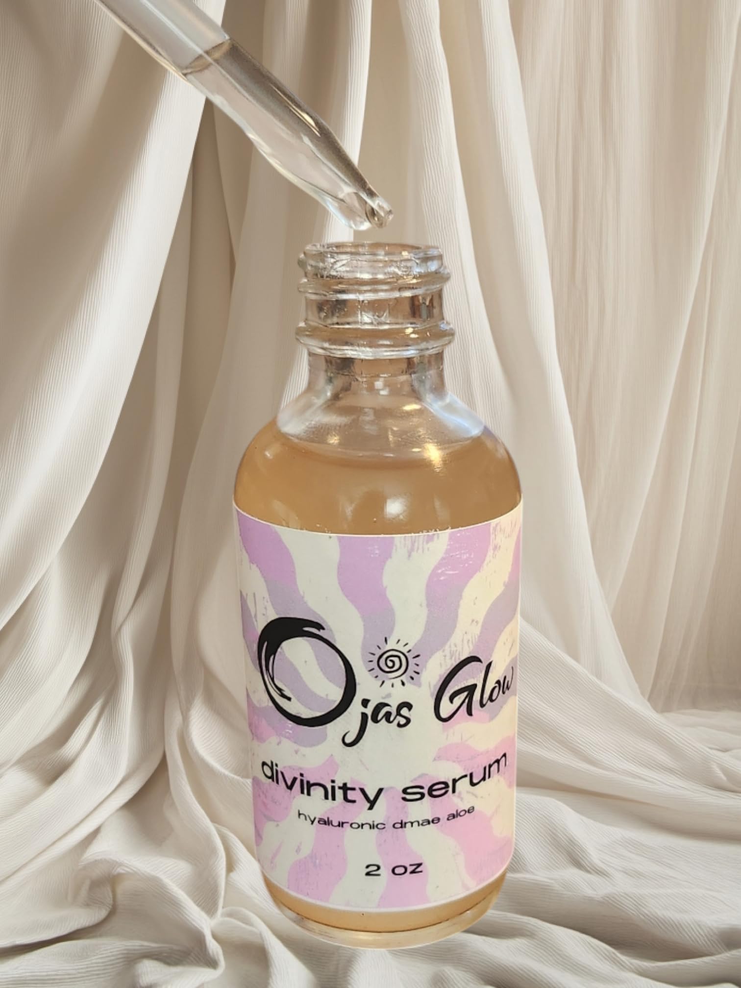 Goddesses! Celebrate your true divinity with Ojas Glow Divinity Serum! This super luxurious serum hydrates and plumps the skin, diminishing fine lines and restoring a healthy, youthful, dewy glow! Ojas Glow Divinity Serum contain Organic Neroli Hydrosol hydrosols are the by-product of steam distilled essential oils, so you get all the benefits of the oil in a water soluble form that is safe to apply directly on the skin. Neroli is rich in natural Vitamin C making it a powerful anti-oxidant. It also adds hydration, softens, sooths and calms skin, and lessens age spots, fine lines and wrinkles. We add calming Blue Lotus water and alcohol free Witch Hazel to calm the skin and tighten pores. Blue lotus helps to balance oil production without depleting the skin of hydration, making it excellent for acne prone skin. Blue Lotus also targets fine lines and wrinkles and improves the overall texture and radiance of the skin. Hyaluronic Acid is the must have skincare ingredient to hydrate the skin! It is a key component of our skin that is naturally occurring in the extracellular matrix, but its production slows down as we age. Hyaluronic Acid is a powerful humectant that binds to water and retains moisture in exponential amounts! Some say it can retain 1000 times its weight in water. This hydrating effect is everything for our skin.plumping fine lines and wrinkles, improving texture and improving skin health at a cellular level. Ojas Glow Divinity Serum also contains DMAE ( Dimethylaminoethanol), an organic compound that also occurs naturally in our bodies. DMAE applied topically has shown to strengthen the dermis, tighten skin, improve fine lines and wrinkles, and even skin tone. DMAE is especially powerful when paired with Vitamin C! Finally, we add Aloe Vera extract to Ojas Glow Divinity Serum to hydrate, calm and sooth the skin and also encourage cellular turnover. These high quality, natural ingredients give Ojas Glow Divinity Serum a beautiful color and light citrus, floral scent adding to the organic luxuriousness of this potent serum. This will be your new must have natural product! Ojas Glow believes firmly in the power of using all natural ingredients nothing fake or artificial . ever!! Ojas Glow Divinity Serum contains a natural preservative approved for Certified Organic skincare products containing fermented radish root and coconut. We always recommend a patch test for potential allergies.