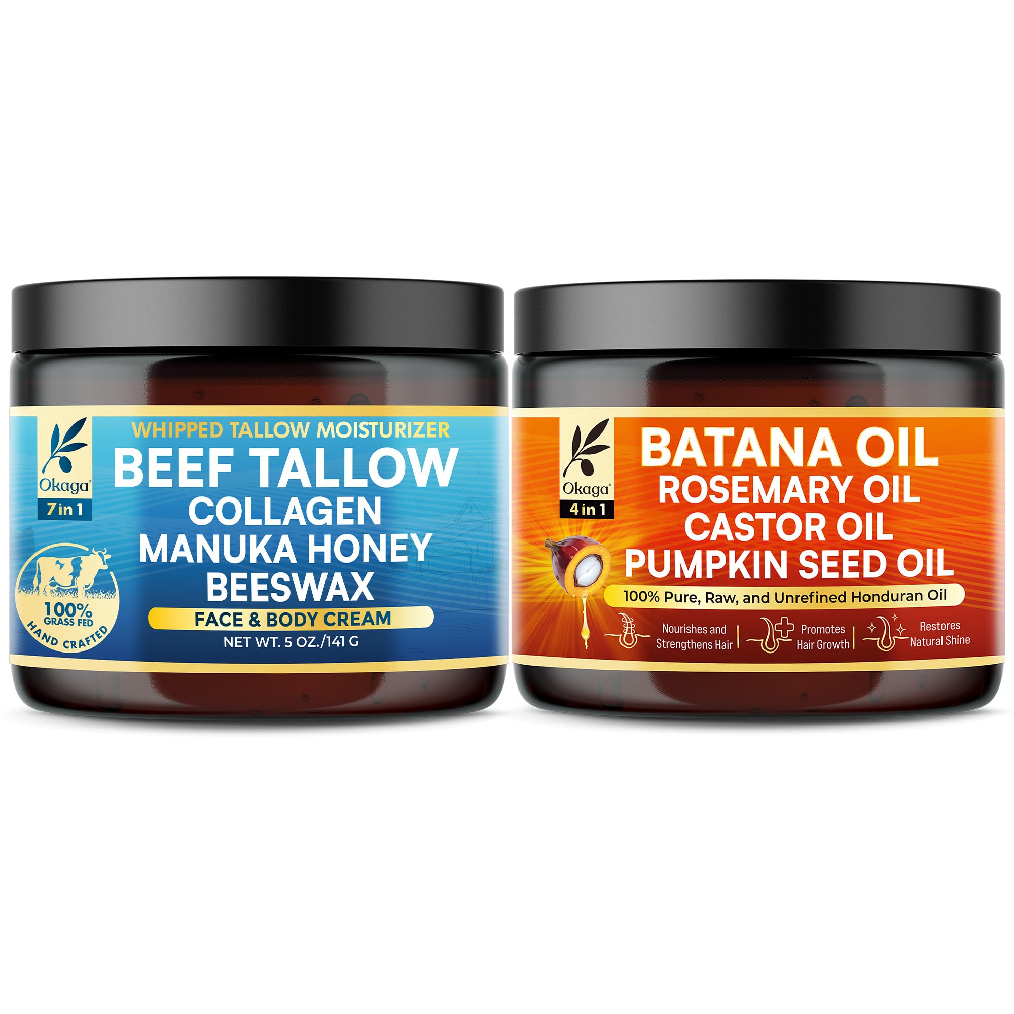 Experience full-body renewal with the Okaga Skin Revival Bundle—a thoughtful pairing of two deeply nourishing creams crafted for holistic beauty and hydration. The grass-fed beef tallow balm hydrates and soothes dry skin with the help of manuka honey, aloe, jojoba, and collagen, while the botanical batana oil cream delivers restorative moisture to scalp, hair, and delicate skin using castor, rosemary, and pumpkin seed oils. Both formulas are lightweight, non-greasy, and fast-absorbing, making them perfect for daily use on face, body, or hair. Designed with clean ingredients and no synthetic additives, this bundle supports smooth, soft, radiant skin and healthy-looking hair—naturally. Embrace the simplicity of nature-powered self-care with Okaga's trusted, family-safe formulas.Crafted for Conscious Living - Ethically sourced and cruelty-free, the Okaga Skin Revival Bundle reflects a commitment to wellness, sustainability, and safe, family-friendly formulations that align with your natural lifestyle. Thoughtfully Formulated Without Compromise - Free from parabens, sulfates, synthetic fragrances, and artificial preservatives, each product is crafted with clean, functional ingredients to support gentle, effective skincare and hair nourishment. Everyday Clean Beauty Ritual – Lightweight, fast-absorbing, and deeply effective, both formulas are perfect for integrating into your morning or evening routine. Whether used as a facial cream, body balm, or hair cream, this bundle supports your natural glow with simple, Earth-sourced care. Nature-Powered Ingredient Synergy – Infused with manuka honey, aloe vera, jojoba, rosemary, and pumpkin seed oils, this duo delivers essential fatty acids, antioxidants, and vitamins that visibly support skin elasticity, texture, and hair manageability—without harsh chemicals or synthetic fillers. Head-to-Toe Hydration Repair – This revitalizing bundle features two ultra-nourishing creams designed for full-body care. The beef tallow balm deeply moisturizes dry skin while the batana oil cream targets scalp, hair, and delicate areas, leaving you soft, smooth, and hydrated all day.