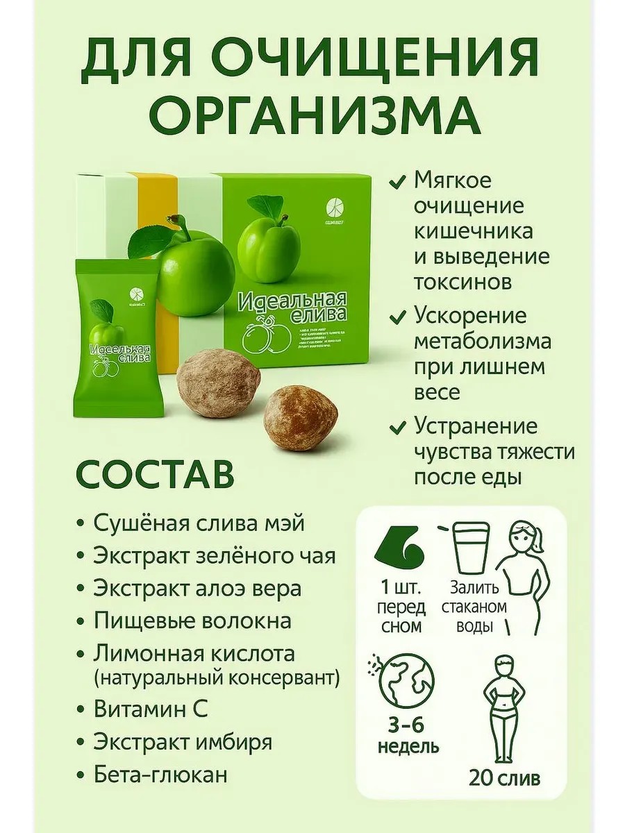 Натуральная слива для похудения и очищения организма — это вкусный и полезный способ поддерживать здоровье и контролировать вес. Продукт создан на основе сушёной сливы мэй (80%) с добавлением натуральных растительных экстрактов и витаминов. Сочетание экстракта зелёного чая, алоэ вера, имбиря, пищевых волокон и витамина С помогает мягко очищать кишечник, выводить токсины и шлаки, улучшать работу пищеварительной системы и ускорять обмен веществ.