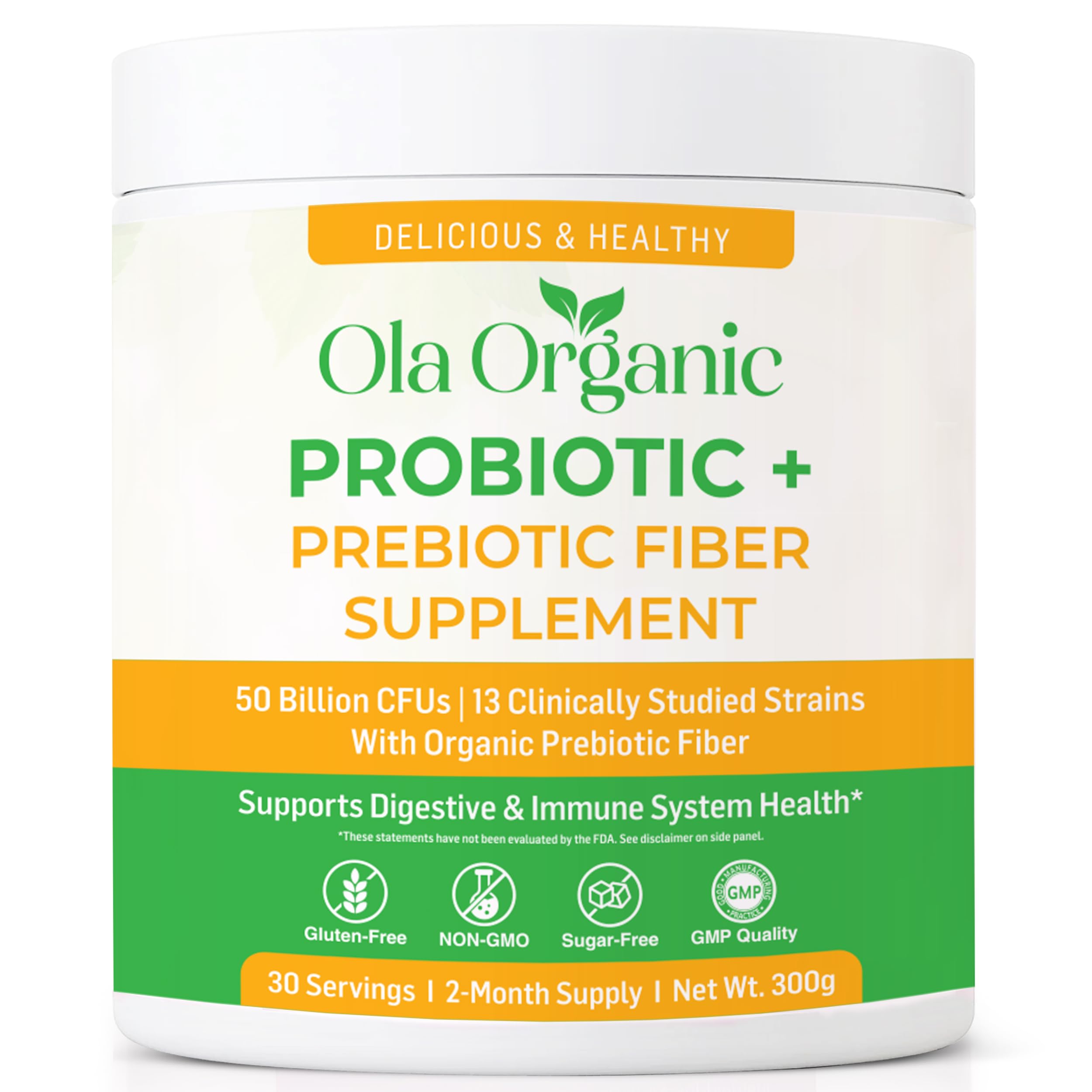 Ola Organic Max Strength Probiotic Powder 60 Billion CFU with Prebiotics & 10 Strains Supports Digestive & Gut Health Non-GMO Formula (300g Jar)