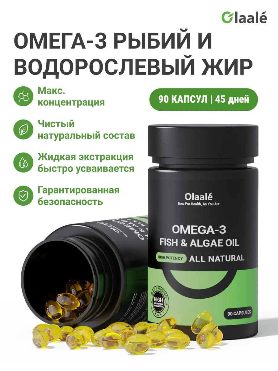 : Продукт содержит Омега-3 жирные кислоты (EPA и DHA) из очищенного рыбьего жира и масла микроводорослей. Поддерживает здоровье сердца, мозга и зрения. Подходит для вегетарианцев, беременных женщин и пожилых людей.