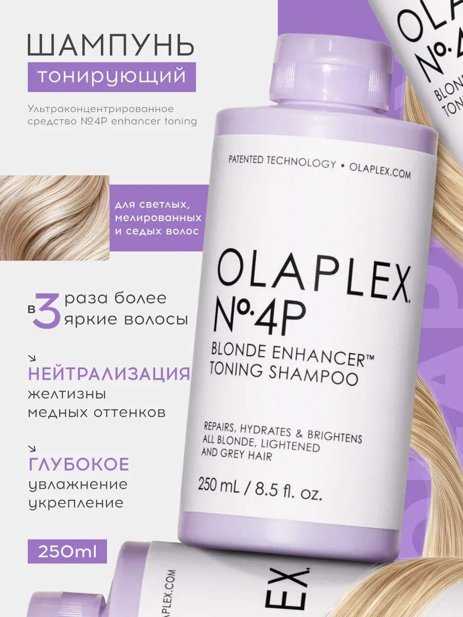| Комплектация | Шампунь тонирующий “Система защиты светлых волос” OLAPLEX No.4P Blonde Enhancer Toning, 250 мл |