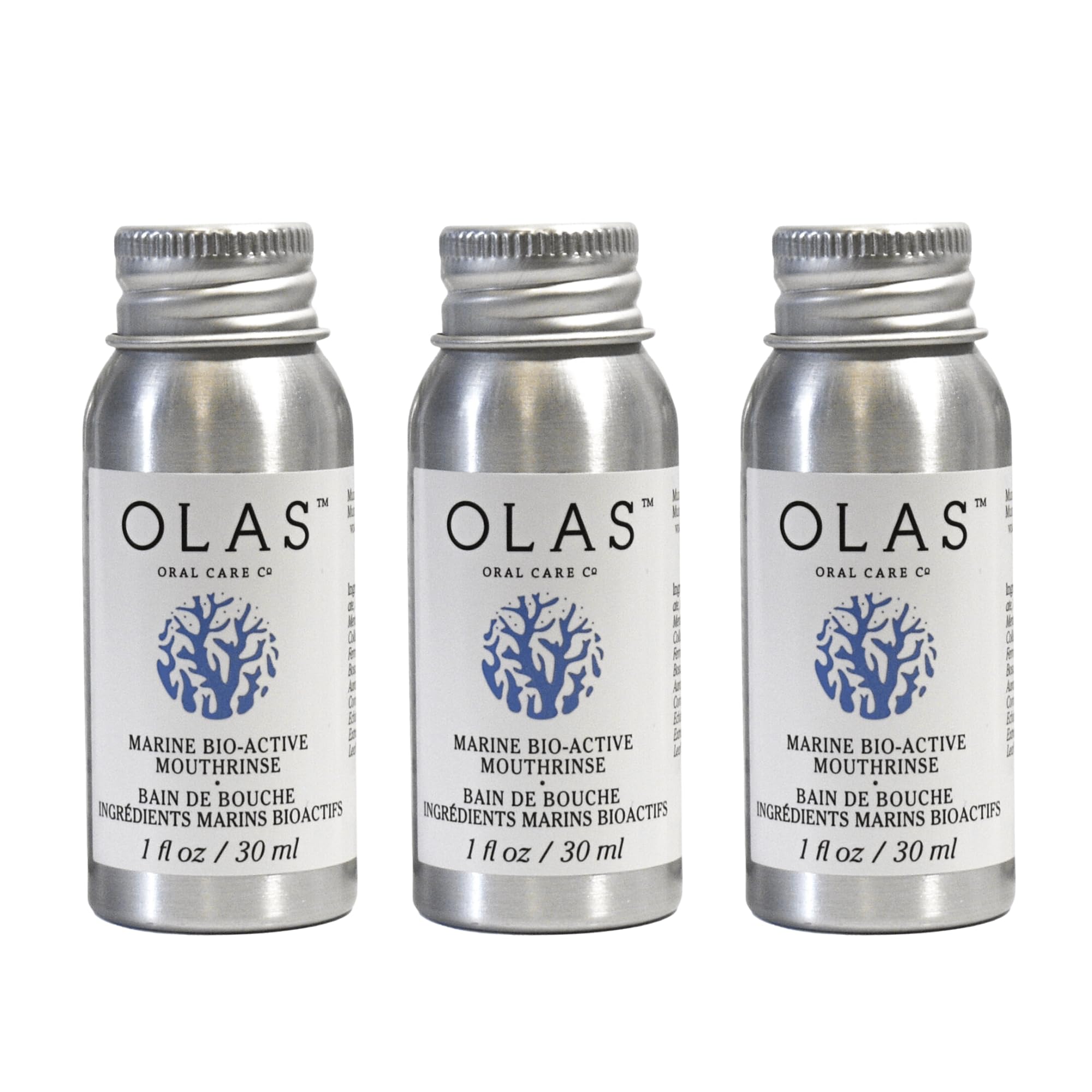 We designed this alcohol free mouth wash for adults who want a refreshing, fluoride free mouthwash they can use to take care of their teeth, gums and general mouth care. Our tooth and gum health mouthwash is formulated with a rich blend of naturally sourced sea salts, marine collagen, and antioxidant CoQ10. The non alcohol mouthwash can help strengthen your oral immune system, promote healthy gums, and freshen breath. The tooth and gum mouthwash uses a marine complex alongside organic essential oils, CoQ-10, and echinacea to help support a healthy oral environment, and gently freshen breath without drying out your mouth. The carefully selected essential oils in this zero alcohol mouthwash include tea tree, chamomile, myrrh, and grapefruit seed. We also use mineral rich sea salts so that this can remain a nourishing mouth wash for gums and sensitive mouthes, as sea salts won't irritate the delicate skin inside the mouth the way that alcohol-based mouthwashes do. Ultimately, we chose to create this no alcohol mouthwash because we believe a balanced mouth creates better conditions for oral care. This is also why our brand draws key ingredients from the ocean, where the natural ecosystem mimics our own bodies.Vegan Cruelty-Free - OLAS is doctor-founded, and all of our formulas are proudly made with responsibly sourced ingredients. This oral rinse mouthwash is no exception, and free of artificial colors and fragrances, parabens, sulfates, and other harmful additives. Convenient Travel Size - Perfect for travel or quick, natural fresh breath on-the-go, our 1 oz OLAS mouth wash packs the same bio-active power in a convenient, compact size. Essential Oils Sea Salt - Our SLS-free mouthwashes use organic, mineral-rich sea salts to temporarily change your mouth's pH environment and make it less hospitable to harmful bacteria. Carefully selected essential oils also help reduce plaque to leave your mouth clean, protected and feeling fresh. Alcohol Fluoride Free - We designed this fluoride and alcohol free mouthwash for adults who want a clean formula that won't sting or burn. The refreshing oral rinse has a sweet mint flavor with hints of thyme, chamomile, cypress and menthol. Innovative Marine Complex - This dentist-formulated mouthwash uses blue-green algae and seaweed extract to provide nourishing marine collagen, calcium and magnesium to your teeth and gums. These ingredients help our mouth rinse support your oral beauty without drying out your mouth.