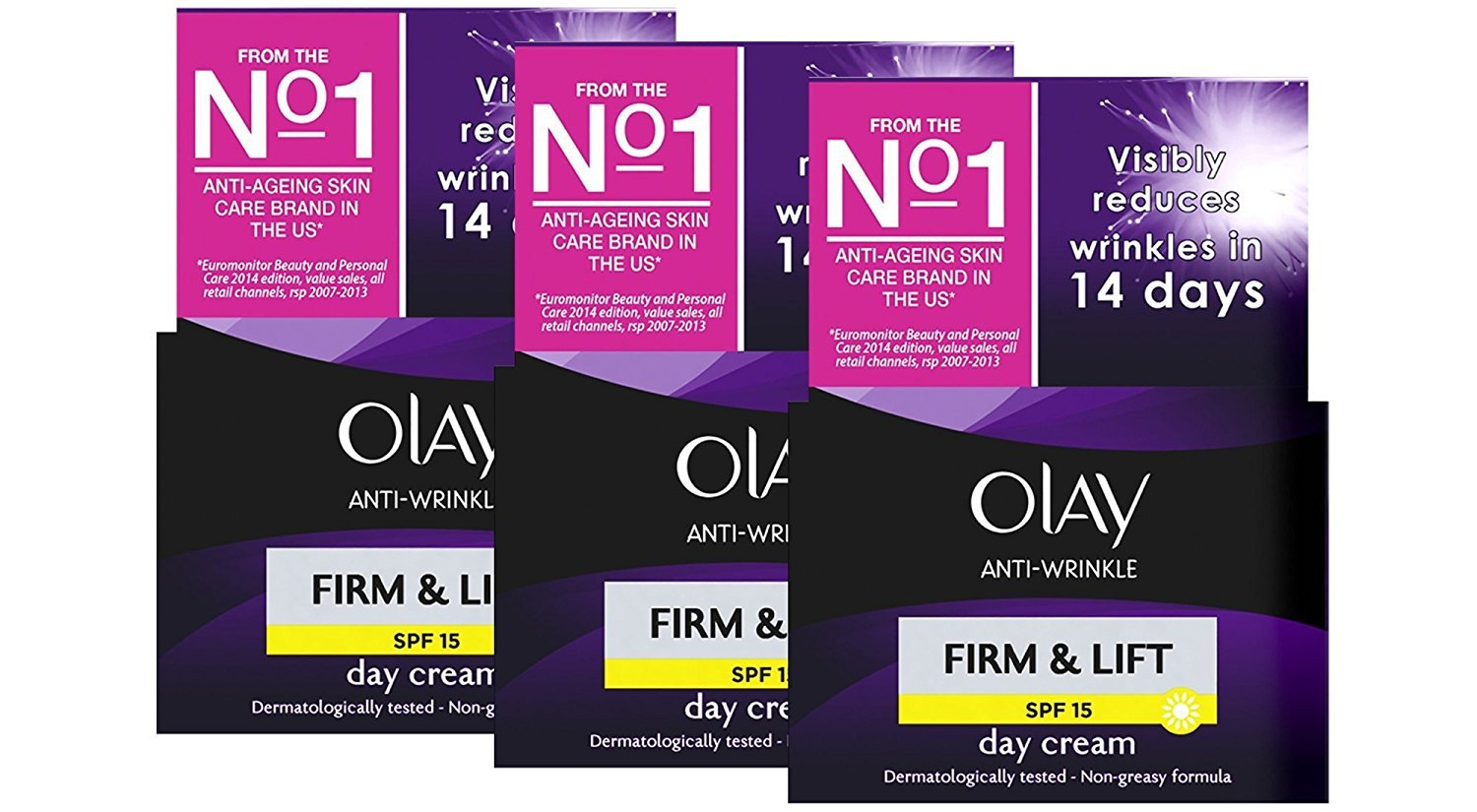 Olay anti-wrinkle firm and lift visibly reduces the signs of aging Anti-aging daily moisturizer with SPF15 and skin renewal complex which activates surface cell renewal to reveal younger looking skin More radiant glowing skin and dermatologically tested, non-greasy formula. Helps reduce the appearance of fine lines Ideal for women aged 40Pack of 3. More radiant, dermatologically tested, non-greasy formula. Ideal for women aged 40 and over. Effectively reduces signs of aging. Firmer appearance. Daily anti-aging moisturizer with SPF15 and Skin Renewal Complex that activates surface cell renewal to reveal younger-looking skin. Olay anti-wrinkle firm and lift visibly reduces the signs of ageing Anti-ageing daily moisturiser with SPF15 and skin renewal complex which activates surface cell renewal to reveal younger looking skin More radiant glowing skin and dermatologically tested, non-greasy formula. Helps reduce the appearance of fine lines Ideal for women aged 40Lot de 3. x2022 peau plus éclatante et testée dermatologiquement, formule non grasse. Idéal pour les femmes à partir de 40 ans. Réduit iblement les signes du illissement. Apparence plus ferme. Crème hydratante anti-âge à usage quotidien avec SPF15 et renouvellement complexe de la peau qui active la surface du renouvellement cellulaire pour révéler une peau plus jeune.