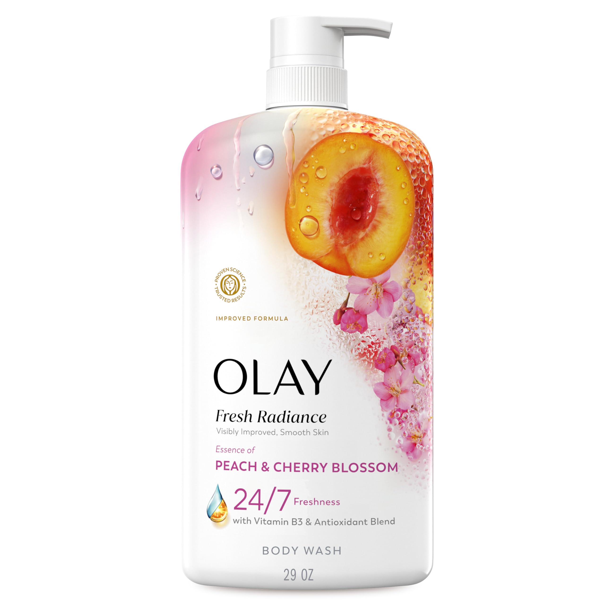Olay Body Wash for Women Fresh Radiance 24/7 Skin-Loving Freshness Visibly Radiant Plant Based Cleansers Vitamin B3 & Antioxidant Blend For All Skin Types Peach & Cherry Blossom Scent 29 fl oz
