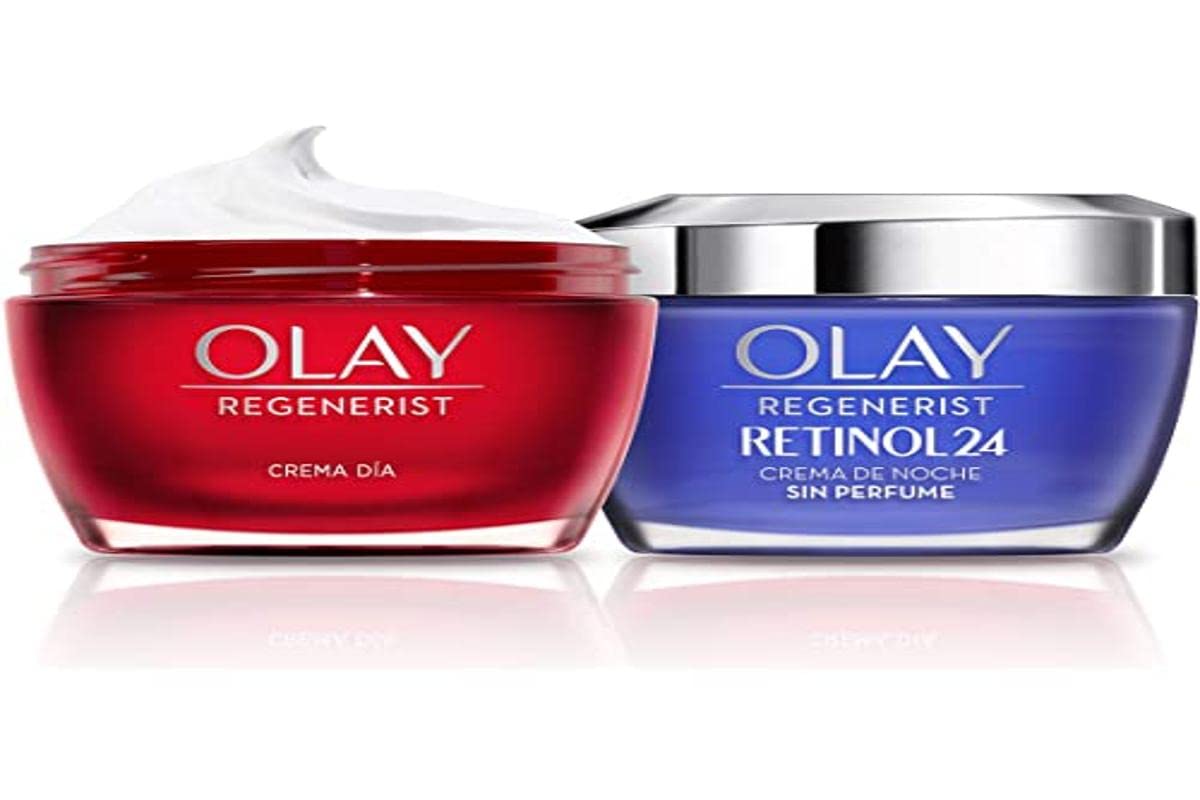 Olay Regenerist Day Moisturizer: Moisturize, firm, and visibly renew your skin with Olay Regenerist Day Moisturizer, Olay's most hydrating product. Its moisturizing formula, enriched with vitamin B3 (niacinamide) and Olay peptides, penetrates deep into the skin's surface and helps optimize cell renewal. Deeply hydrates for 24 hours, visibly renews, and firms the skin. Our moisturizing and anti-aging cream is suitable for all skin types, including normal, dry, and oily. Use Olay Regenerist Day Moisturizer for 28 days. Visibly renew the appearance of your skin. Olay Retinol24 Night Moisturizer: Wake up to softer, more radiant skin with Olay Regenerist Retinol24 Night Facial Cream. Olay Regenerist Retinol 24 Serum combines two powerful ingredients: vitamin B3 (niacinamide) and a retinoid complex to provide 24-hour hydration, along with other benefits. This retinol night cream visibly improves the appearance of fine lines and wrinkles, texture, radiance, firmness, dark spots, and pores. This 24-hour retinol night cream is quickly absorbed and treats the deeper layers of the skin's surface, leaving you waking up each morning with younger-looking, more radiant skin. The formula of this 24-hour retinol night cream is fragrance-free and dye-free. Try Olay Retinol 24 Night Cream for 28 days. Experience a true skin transformation. Olay Retinol 24 Night Cream is suitable for daily use on dry, oily, and normal skin.Night Moisturizing Cream: Provides 24-hour hydration, visibly improving the appearance of fine lines and wrinkles, texture, radiance, firmness, dark spots, and pores. Night Moisturizing Cream: For visibly softer, more radiant skin. Formulated with two effective skin-beneficial ingredients: retinoid complex and vitamin B3. Day Face Cream: Visibly transforms skin in 28 days. Day Face Cream: Intensely hydrates skin for 24 hours helps optimize cell renewal, improving skin texture. Day Face Cream: Formulated with vitamin B3 and aminopeptides, two powerful skin-care ingredients. Penetrates deeply into the skin's surface. Day Face Cream: A daily face cream that visibly renews skin's radiance silky-smooth texture for dry to combination skin.Olay Regenerist Crème visage de jour et Olay rétinol 24 crème hydratante de nuit au rétinol, lot de 2 unités, 24h d'hydratation, 100 mlDESCRIPTION DU PRODUIT Crème de jour hydratante Olay Regenerist : hydrate, raffermit et renouvelle visiblement votre peau avec la crème de jour Olay Regenerist, le produit le plus hydratant d'Olay. Sa formule hydratante enrichie en vitamine B3 (niacinamide) et en peptides de Olay pénètre profondément dans la surface de la peau et aide à optimiser son renouvellement cellulaire. Hydrate en profondeur pendant 24 heures, renouvelle visiblement et raffermit la peau. Notre crème hydratante et anti-âge convient à tous les types de peau, y compris normale, sèche et grasse. Utilisez la crème de jour Olay Regenerist pendant 28 jours. Renouvelez visiblement l'apparence de la peau. Crème hydratante de nuit Olay Retinol24 : réveillez-vous avec une peau plus douce et éclatante avec Olay régénérist rétinol 24 crème de nuit pour le visage. Olay Regenerist Rétinol 24 Sérum combine deux ingrédients très puissants : la vitamine B3 (niacinamide) complexe rétinoïde pour offrir 24 heures d'hydratation, ainsi que d'autres propriétés. Cette crème visage de nuit au rétinol améliore visiblement les rides et ridules, la texture, la brillance, la fermeté, les taches et les pores. Cette crème de nuit au rétinol 24 est rapidement absorbée et traite les couches profondes de la surface de la peau pour vous réveiller chaque matin avec une peau plus jeune et radieuse. La formule de cette crème visage au rétinol 24 ne contient ni parfum ni colorant. Essayez Olay rétinol 24 crème de nuit pendant 28 jours. Faites l'expérience d'une véritable transformation de la peau. La crème de nuit Olay Retinol 24 est adaptée pour une utilisation quotidienne sur les peaux sèches, grasses et normalesCrème hydratante de nuit : hydrate 24 h, améliorant visiblement les rides et ridules, texture, brillance, fermeté, taches et pores. Crème hydratante nuit : pour une peau visiblement plus douce et radieuse. Formule avec deux ingrédients efficaces pour la peau : complexe rétinoïde et vitamine B3. Crème visage jour : transforme visiblement la peau en 28 jours. Crème visage jour : hydrate intensément la peau pendant 24 heures aide à optimiser son renouvellement cellulaire, améliorant la texture de la peau. Crème visage de jour : formulée avec de la vitamine B3 et des aminopeptides, deux ingrédients puissants pour le soin de la peau. Pénètre profondément la surface de la peau. Crème visage de jour : crème visage quotidienne qui renouvelle visiblement l'éclat de la peau texture soyeuse et douce pour les peaux sèches à mixtes.