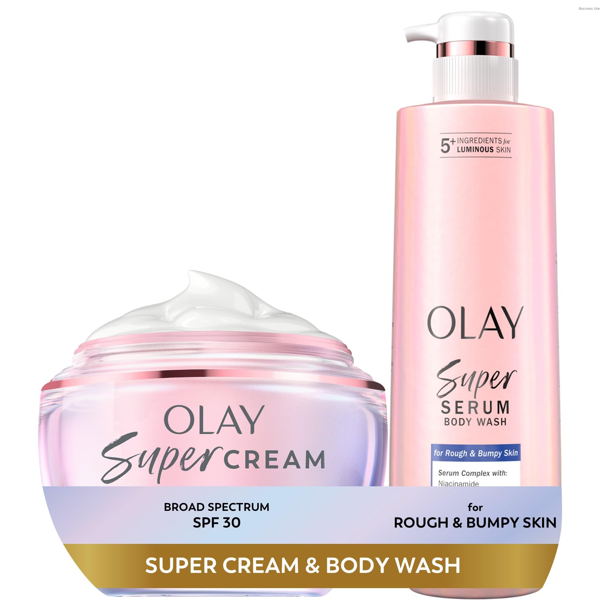 [Body Wash] SKIN-FRIENDLY FORMULA: This body wash is Dermatologist-tested and free of phthalates and silicones. [Body Wash] LUMINOUS SKIN: Reveal your best skin with 5 advanced ingredients formulated for the Super Serum Body Wash. [Super Cream] PROTECTS: Moisturizer with SPF 30 that helps protect your skin against UVA UVB sun damage, without the heavy stickiness of sunscreen. [Super Cream] SMOOTHS: Facial moisturizer with rich ingredients visibly reduces dark spots and fine lines. [Super Cream] HYDRATES: SPF face moisturizer provides long-lasting hydration of up to 24 hours and hydrates better than the 1 Luxury Facial Moisturizer with Sunscreen (based off P12M Unit Sales quarter end 12 31 2024). BUNDLE SAVE: You will receive ONE Olay Super Cream with Sunscreen SPF 30 (1.7 Fl Oz) and ONE Olay Super Serum Body Wash for Rough Bumpy Skin (18.5 Fl Oz).