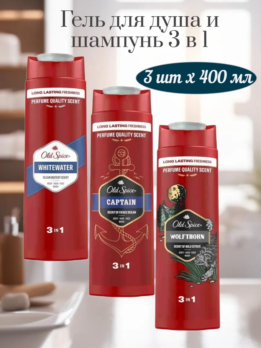 Гели для душа + шампунь от Old Spice - технология усиленной защиты от запаха пота на 12 часов. Средство 3 в 1 для лица, тела и волос может выполнять роль геля для душа, шампуня и средства для умывания. Содержит увлажняющие компоненты, смывает бактерии, не содержит парабенов. Гели для душа для мужчин обладают топовыми ароматами. Линейка Whitewater обладает чистым водным ароматом свежести. Линейка Captain обладает ароматом бушующего океана. Линейка Wolfthorn обладает диким ароматом цитрусов.