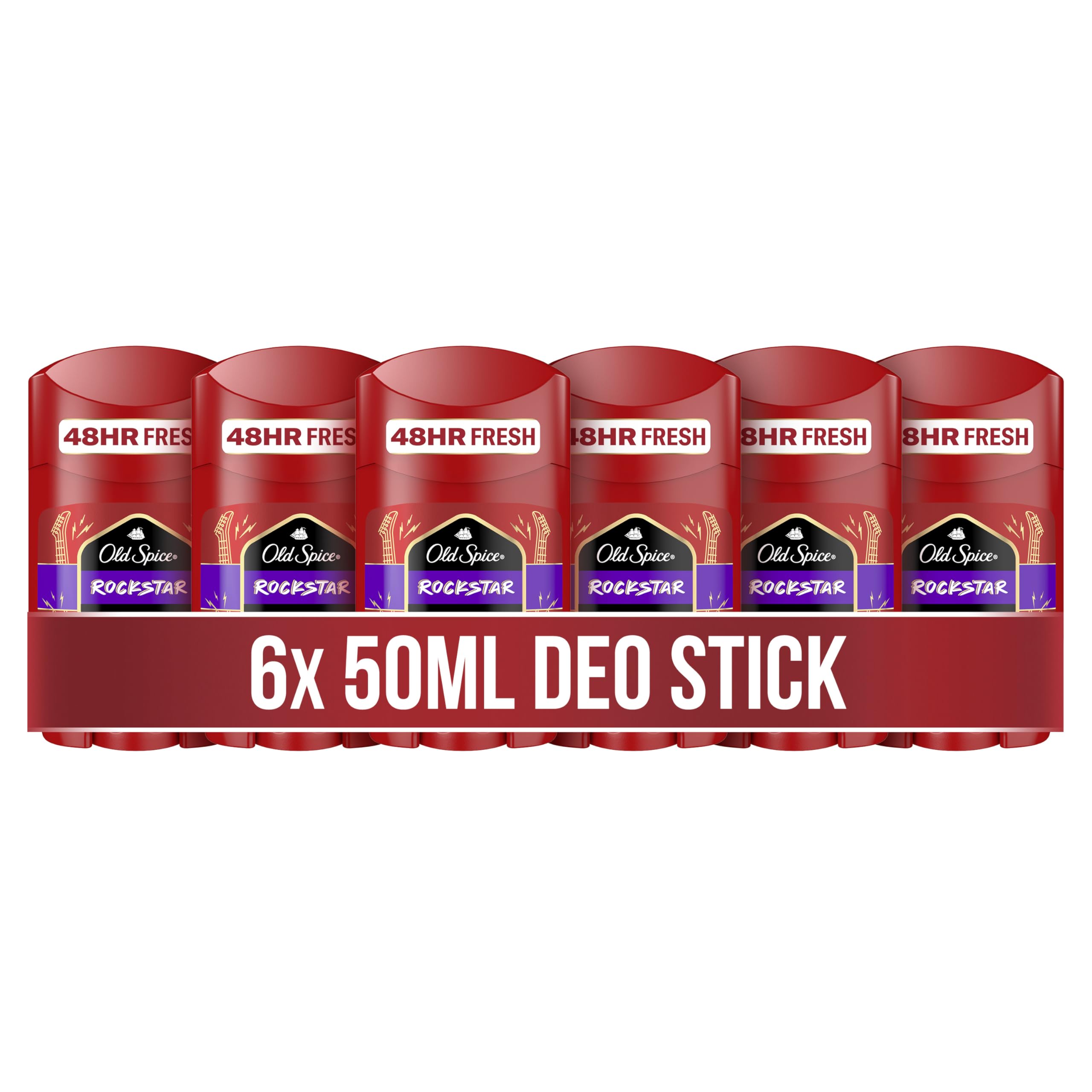 Old Spice Rock Lot de 6 déodorants en stick pour homme, 6 x 50 ml, fraîcheur 48 h, parfum longue durée, 0 sels d'aluminium, pas de taches sur le noir et le blanc, fabriqué à partir de 50 de