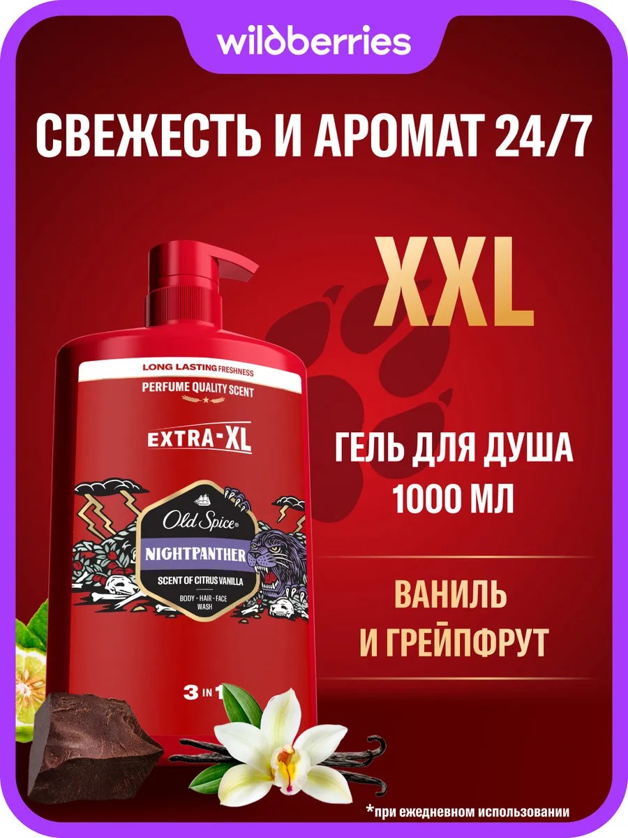 Do you know how important scent is during a hunt? Many predators even know how to camouflage themselves, hiding their scent to avoid a false scent—like the panther. But this certainly won't apply to you, because Old Spice Night Panther 3-in-1 Shower Gel + Shampoo for Body, Hair, and Face is the irresistible scent of a nocturnal predator with notes of vanilla and grapefruit that fills the space around you and makes you the center of the universe. The refreshing foam of Old Spice shower gel in an extra-XL 1L container easily eliminates all unpleasant odors, and special technology ensures ironclad durability and aroma intensity throughout the day. Old Spice Night Panther 3-in-1 Shower Gel + Shampoo for Men is for nocturnal hunters who leave stuffy offices and explore the urban jungle on long summer nights. Get a wild Old Spice boost from the morning – try our men's shower gel and shampoo, then use our men's deodorant spray or stick to make your prey follow you! Benefits: - 3-in-1 shower gel and shampoo – for those with body, hair, and face; - Up to 100 days of freshness; - Washes away dirt and odor, leaving a masculine aroma and freshness; - A dynamic, vibrant scent that will stay with you all day.