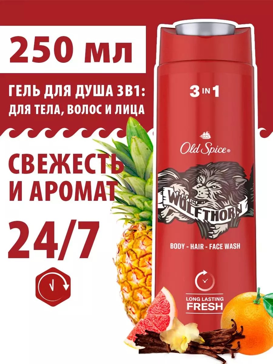 Аромат мужского шампуня геля для душа 3 в 1 250мл (Олд Спайс гель для душа) Wolfthorn – это настоящий залог удачной охоты с нотками цитрусовых и финальным аккордом уверенности в себе. Ты смело можешь заниматься своими хищными делами, выискивая по ночам симпатичную добычу и преследуя самые амбициозные цели, подобно настоящему волку, ведь твой союзник – шампунь и гель для душа мужской 3 в 1 Old Spice с железобетонно стойким ароматом, который борется с неприятным запахом.