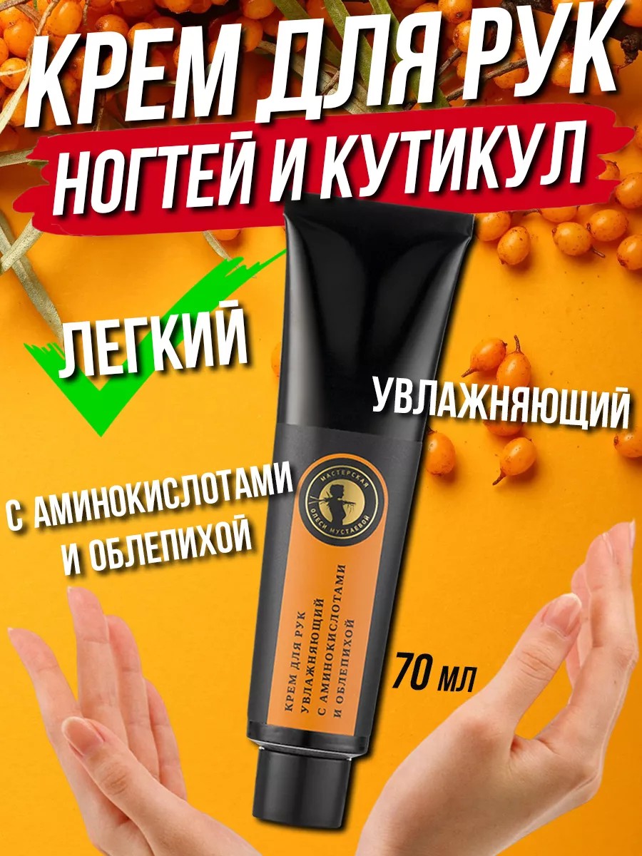 Правильный уход за руками сделает их мягкими и нежными. Легкий крем для рук с аминокислотами и облепихой бережно ухаживает за вашими руками и кутикулой, придает коже бархатистость. Этот восстанавливающий крем для рук от сухости увлажняет потрескавшуюся кожу и эффективно защищает ее от негативного воздействия холода и ветра - защитный крем для рук. Масло облепихи, в составе крема для рук, богатое витаминами и каротиноидами, помогает уменьшить глубину морщин и повысить плотность кожи, а также оказывает омолаживающий эффект. Аминокислоты защищают кожу от высушивания, увлажняют ее, способствуют повышению упругости. Омолаживающий крем для рук подходит тем, чья работа связанна с бумагами или длительным нахождением в перчатках. Эффективно увлажняет и быстро впитывается. Крем для рук увлажняющий с аминокислотами и облепихой сертифицирован по стандарту халяль, есть декларация о соответствии. Это универсальная уходовая косметика - можно использовать и как мужской крем для рук (крем для мужчин). Способ применения: небольшое количество крема нанести на сухую и чистую кожу тыльной стороны кисти. Использовать 1-2 раза в день. При возникновении реакции на натуральный крем для рук рекомендуем снизить частоту применения или отменить. Олеся Мустаева и её натуральная косметика для тела заботятся о Вашей красоте и здоровье! ИП Попов Алексей Александрович является официальным продавцом бренда "Мастерская Олеси Мустаевой" (МОМ) на сайте Wildberries. Сделано в России с любовью. У нас только оригинальная продукция!