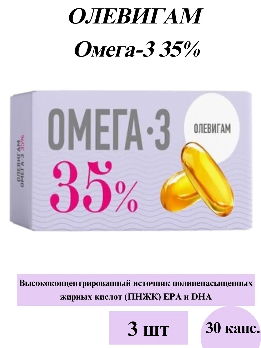 Олевигам-омега 35% оказывает влияние на обмен веществ в организме, в том числе и на клеточном уровне. Способствуют защите наших клеток от преждевременного старения, регулируют жировой обмен. Омега-3 способствуют очищению стенок сосудов от избытка холестерина, предотвращая образование холестериновых бляшек. Помимо этого, входящие в состав Омега-3 эйкозапентаеновая и докозагексаеновая кислоты нормализуют вязкость крови и способствуют повышению уровня хорошего холестерина. Содержание активных веществ в 1 капсуле: ПНЖК Омега-3 - 350 мг, в том числе эйкозапентаеновой кислоты - 180 мг; докозагексаеновой кислоты - 120 мг. Способ применения и дозы: детям старше 7 лет и взрослым, в том числе женщинам, готовящимся к беременности, беременным и кормящим грудью по 1 капсуле 2 раза в день во время еды. Продолжительность приема - 1 месяц. Не является лекарственным средством.
