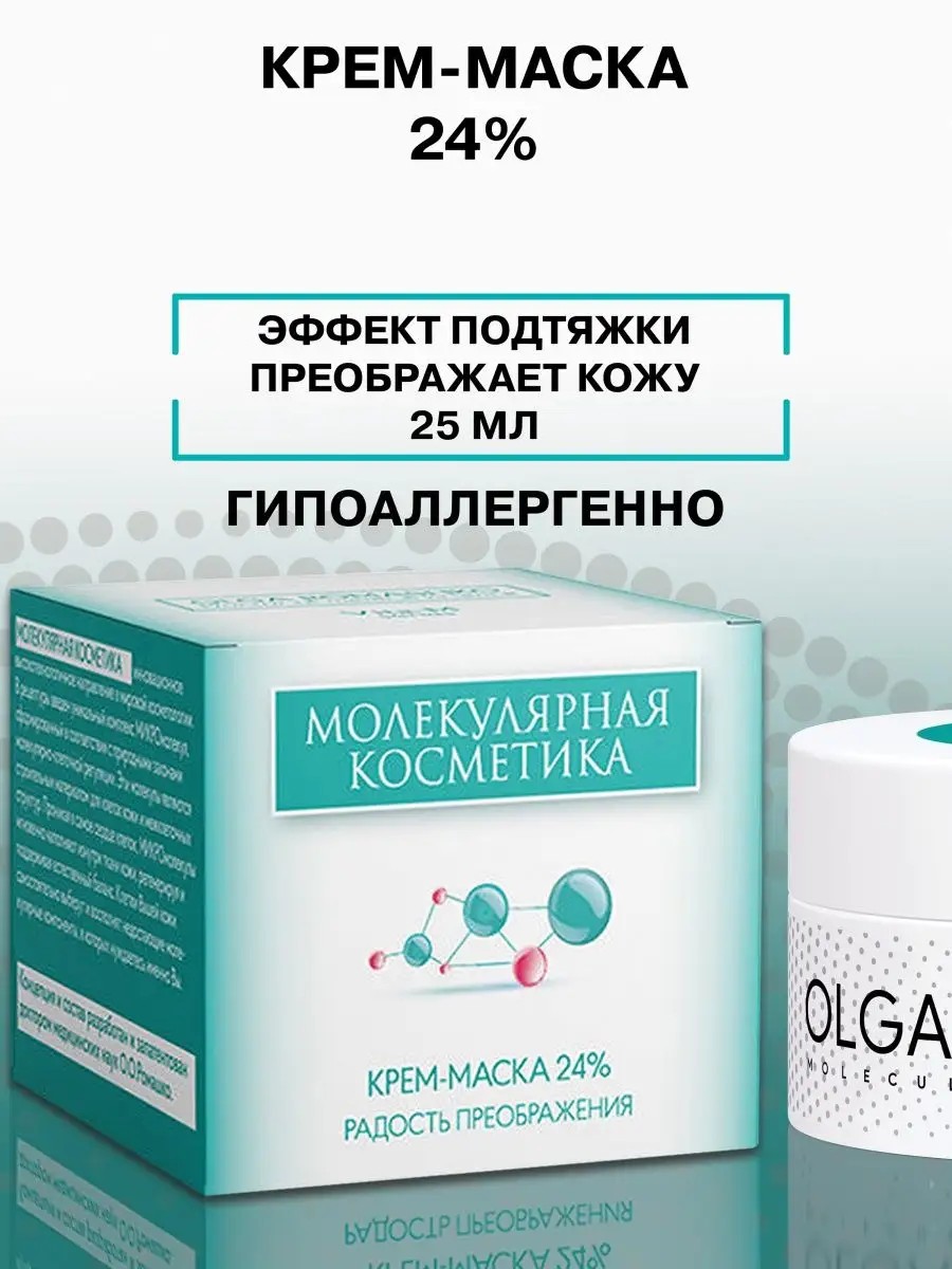Крем-маска 24% молекулярный (против морщин). Восхитительная тающая МАСКА с чуть уловимым деликатным ароматом мгновенно впитывается, подтягивая контур лица за счет выраженного лифтинг-эффекта. Кожа преображается, становясь заметно моложе, благодаря глубокому проникновению и слаженной работе мельчайших естественных молекул, входящих в состав инновационного MICROmolecular Complex. Эти молекулы самой природой предназначены для восстановления, омоложения и увлажнения Вашей кожи. Гипоаллергенно. Перед выходом наносите МАСКУ тонким слоем на чистое лицо, шею и декольте. После 40 лет МАСКУ можно использовать как дневной крем летом, весной и осенью. Нанесение под МАСКУ СЫВОРОТКИ усиливает эффект. Клинически проверено. Рецептуры запатентованы.