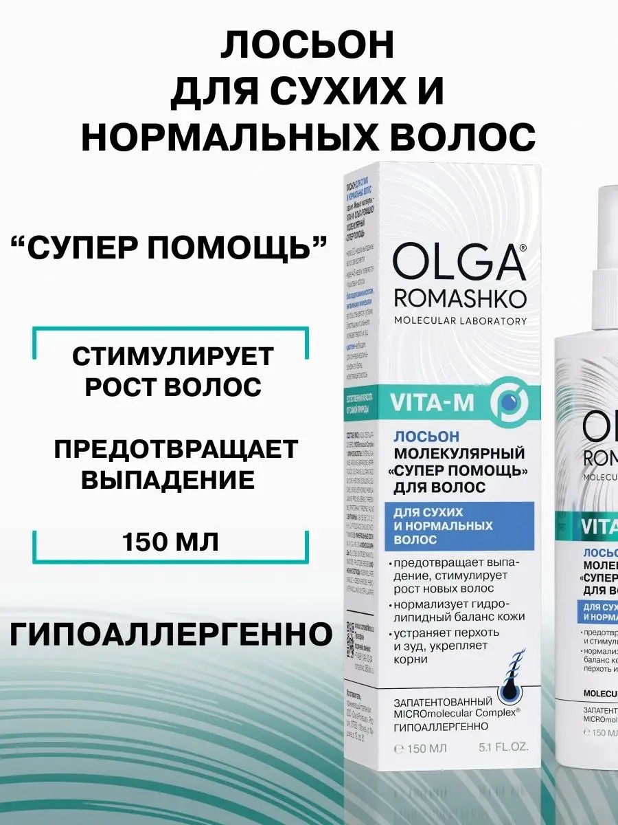 The lotion really works! Molecular lotion "Super Help" for dry and normal hair "Olga Romashko". Live molecules restore the scalp, penetrating into cells. This creates optimal conditions for growth, hair restoration, and the elimination of dandruff. After all, the health of the hair is primarily determined by the condition of the scalp. As a result, itching and dandruff disappear. After 2-3 weeks of use, hair loss slows down. In addition, hair growth in the initial stages of baldness resumes. IMPORTANT! You should not be alarmed if at the beginning of treatment you feel that your hair is falling out more. This is weakened, dying hair. You will feel the effect of using the "Olga Romashko" Lotion in 2-3 weeks. After washing your hair and then every other day, rub the Hair Lotion into the scalp with strong massaging movements of your fingers for 3-5 minutes. After treating the scalp with the Lotion, there is no need to rinse it off. Living Molecules will continue to work for the benefit of your hair for a long time. You need two bottles for the course. By strictly following the instructions, you will be pleased with the results. For very dry skin, it is beneficial to use a 66% cream mask 1-2 times a month. How to do it? Wash your hair with Olga Romashko shampoo. Rub the 66% cream mask into your scalp, wrap your head with a soft terry towel, and leave it on for 40 minutes. Then rinse with warm water and shampoo or (if your hair is very fine and dry!!!) with hot water without shampoo. Dry your hair and massage in the Hair Lotion as directed above. The low-molecular components included in the MICROmolecular Complex are natural building blocks for hair and skin. They generously nourish hair from root to tip, restoring strength, health, purity, and radiance, and promoting new hair growth. Nourished skin feels comfortable, dandruff and itching disappear. Nicotinic acid for hair promotes beard, mustache, and eyebrow growth in men. Cysteine is essential for the synthesis of keratin, the main protein that strengthens hair. For optimal results, use with OLGA ROMASHKO Shampoo for Weakened and Colored Hair, OLGA ROMASHKO Hair Mask, and OLGA ROMASHKO Hair Conditioner. It significantly increases the effectiveness of the Lotion by increasing the exposure time of beneficial molecules to the skin. With our set of hair cosmetics and care products (hair care), success is guaranteed! This hair lotion has been dermatologically tested. Thousands of women enjoy using it as a hair growth, nourishment, and hydration product. The Russian answer to Korean cosmetics. The formulas are patented.