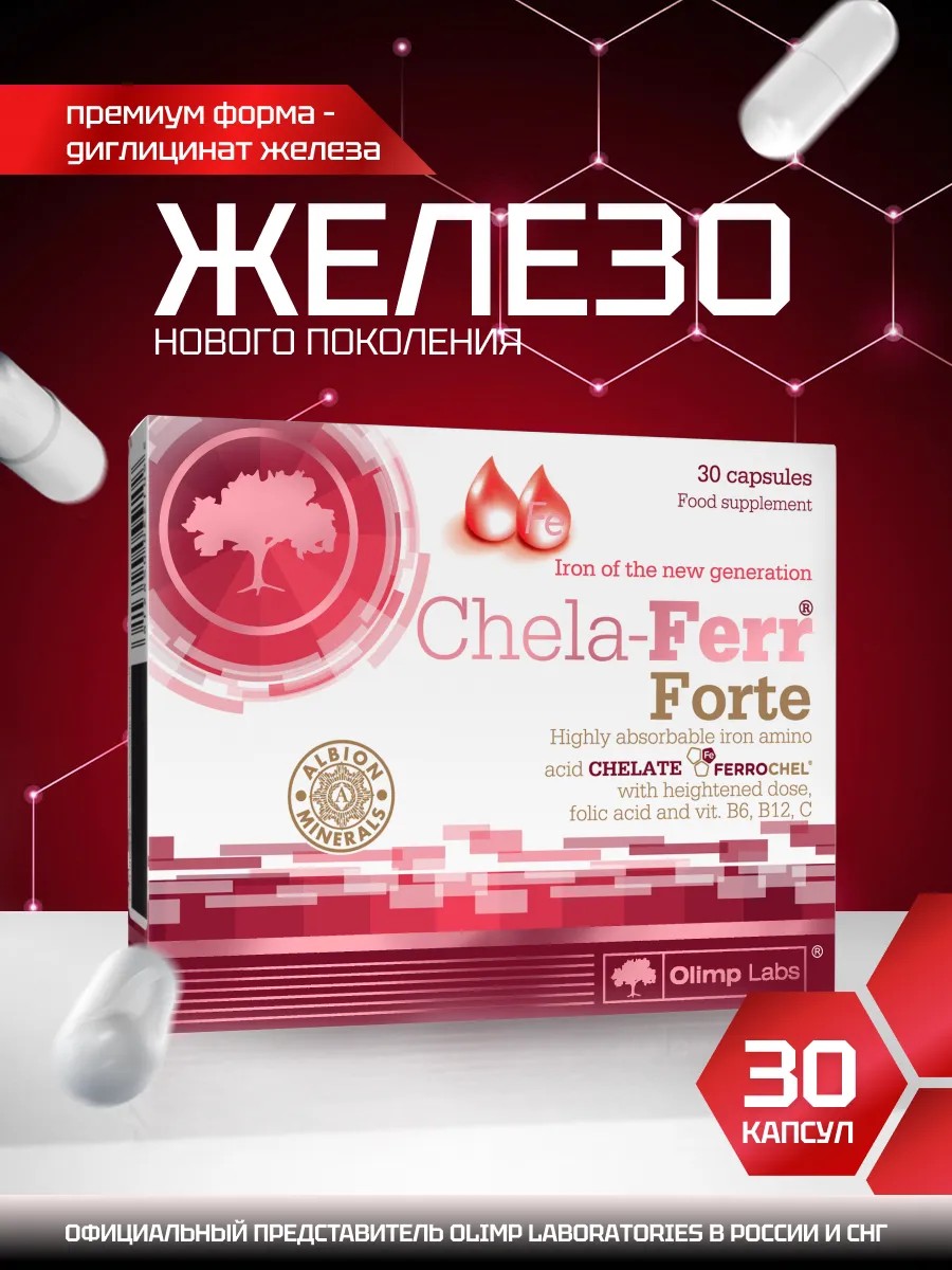 Chela-Ferr Forte - витаминно-минеральный комплекс, содержащий железо Ferrochel (в форме хелата аминокислот) - хорошо усваиваемая форма в повышенной дозе, обогащенная фолиевой кислотой и витаминами: B6, B12, C.
