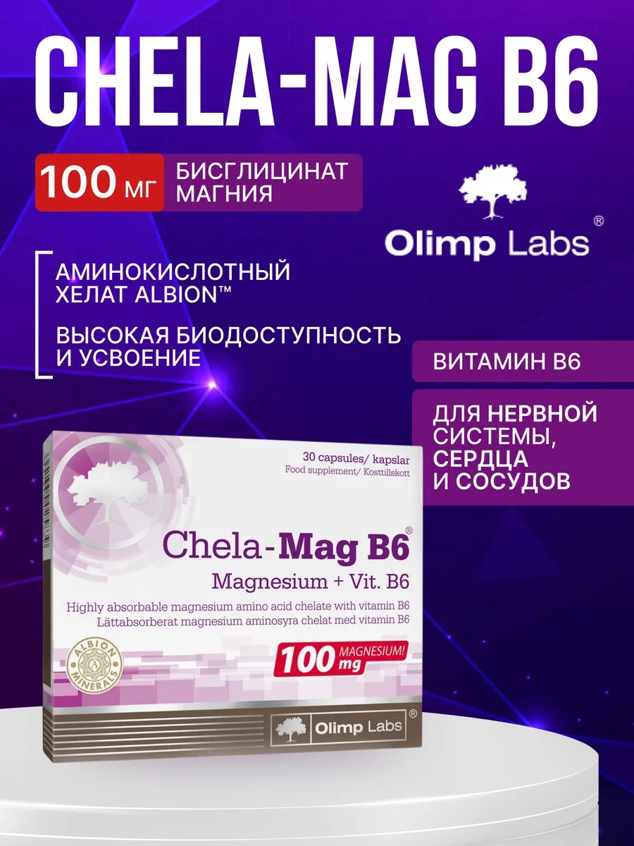 Chela-Mag B6 - это пищевая добавка, которая содержит формулу магния с высокой усвояемостью в форме хелата аминокислоты Albical (бисглицинат магния), обогащенного витамином B6, который взаимодействует с магнием в метаболических процессах.Научные исследования доказали, что магний:- помогает в правильном функционировании мышц;- вместе с витамином B6 он помогает в правильном функционировании нервной системы и поддержании психологических функций, а также снижает усталость и утомляемость;- помощь в поддержании здоровья костей и зубов;- учавствует в поддержании электролитного баланса;- помогает в правильном энергетическом обмене и способствует правильному синтезу белка. Усвояемость магния из бисглицината в несколько раз выше, чем из неорганических соединений, таких как оксид, сульфат и карбонат. В 1 капсуле: аминокислотный хелат магния Albion - 100 мг; Витамин B6 - 2,1 мг. Принимать по 1 капсуле в день после еды или после консультации с врачом.