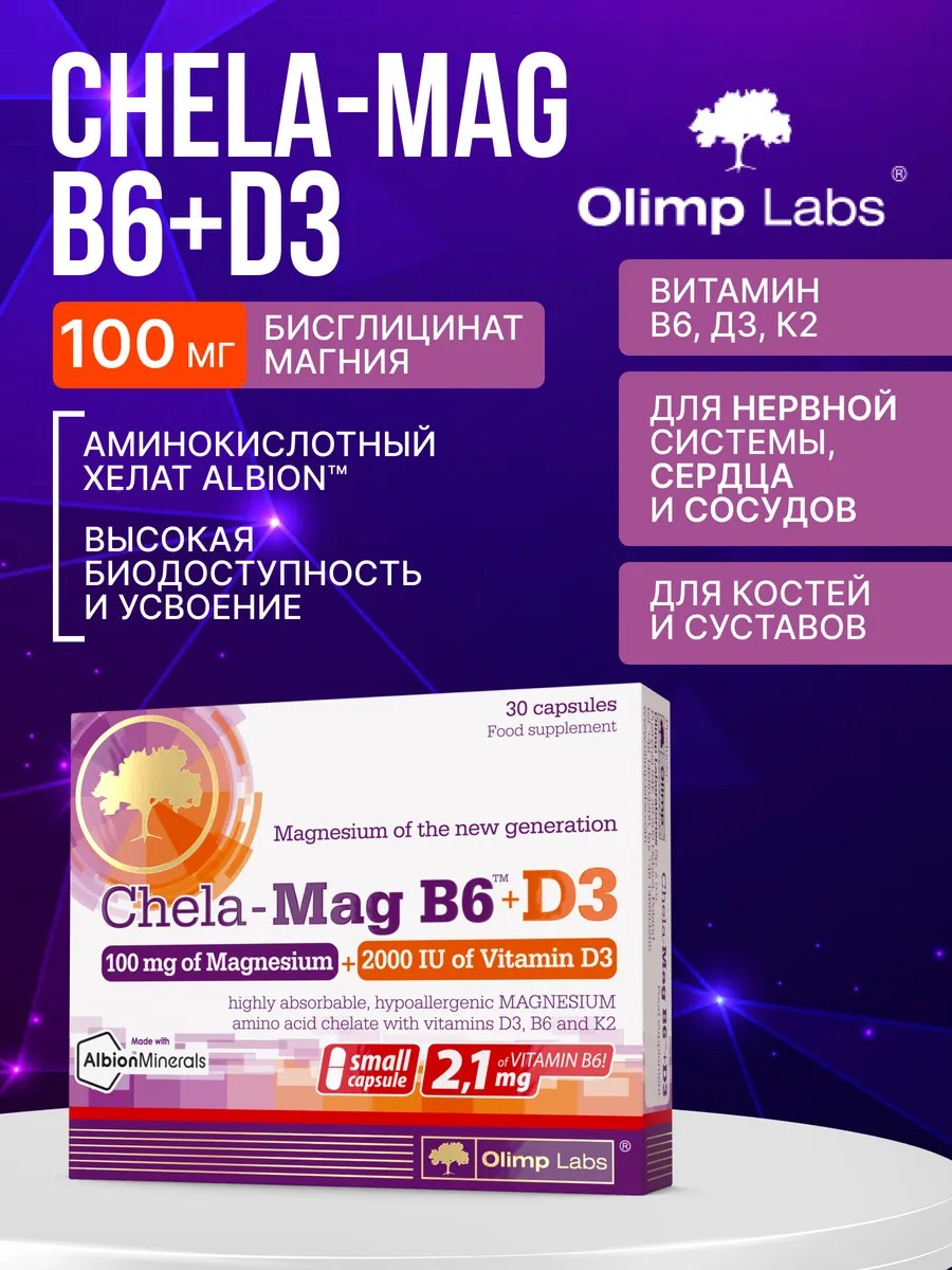 Chela-Mag B6 + D3 - это пищевая добавка с уникальным сочетанием высокобиодоступного магния в форме хелата аминокислот Albion с 2000 МЕ витамина D3 и витаминов B6 и K2. Магний является важным элементом биосинтеза активной формы витамина D. Исследования показывают, что потребление магния с диетой или добавками снижает вероятность недостаточного уровня витамина D в организме и его последствия. Кроме того, было замечено, что витамин D может стимулировать всасывание магния в кишечнике. Исследования показывают, что магний:помогает в правильном функционировании мышц; играет роль в правильном функционировании нервной системы, помогает поддерживать правильные психологические функции, способствует снижению утомляемости и утомляемости, участвует в поддержании здоровья костей и зубов и электролитного баланса, участвует в эффективном энергетическом обмене и помогает в правильном синтезе белка.