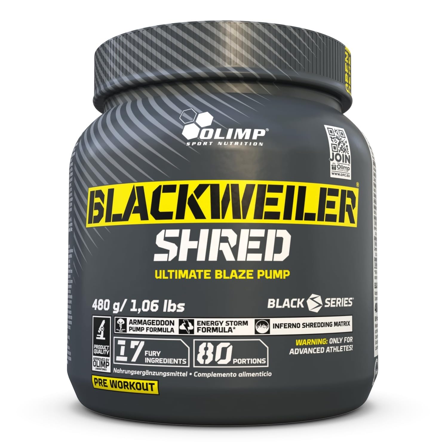 Blackweiler Shred Dietary supplements with sweetener in powder form.The preparation is a composition of amino acids (L-arginine, beta-alanine, L-citrulline and taurine), vegetable extracts (Wasabi, cocoa, ginger and green tea extract as well as cayenne pepper and black pepper extract) and caffeine, supplemented withVitamins and minerals. Niacin and Thiamin contribute to a normal energy metabolism.The product is only intended for physically active adults and professional athletes.Recommendation for consumption: Take 1-3 portions about 30 minutes before training every day.Dissolve 1 serving (6 g ½ measuring spoon) in 100 ml of water.Eat immediately after the preparation.The recommended daily dose should not be exceeded.Dietary supplements should not be used as a replacement for a varied, balanced diet and healthy lifestyle. Ingredients ingredients L-arginine alpha-ketoglutarate, flavors, beta-alanine, acid gulchers citronic acid, ethnic acid Thickener rubber arabicum, xanthan, sodium carboxymethylcell cellulose L-Citrullin, sodium citrate, calcium salts of orthophosphoric acid (calcium phosphate), taurin, wasabi root extract (wasabia japonica (Miq.) Matsum.), Silicium dioxide separating agent Dye E 150D (at taste spicy cola) Caffeine, cocoa seed extract (Theobroma Cacao L.), ginger Rhizom extract (Zingiber officinale Rosc.), Grüntee-Blatt extract (Camellia sinensis (L.) Kuntze), sweetener acesulfam k, sucralose Nicotinamid-Niacin, Black Pepper-Fruit Extract (Piper Nigrum L.), Cayennepfeffer-Frucht-Extract (Capsicum Annuum L.), Pyridoxinhydrochloride-Vit. B6, Thiaminhydrochloride-Vit. B1, Dyks (A), Eche Karmin(B), Riboflavine (C), E 150C (D), E 150D (E), E 133 (F), Patent Blau V (G), Indigokarmin (H), Chlorophylle and Chlorophylline (I), turmeric (J),Anthocyans (K), paprika extract (L), betanine (m), plant cubes (s).(A)-(z)-Depending on the taste of the product, the symbol (A-Z) of the components used is located in addition to the best before date (at least durable to).The product was made in a company that also processes ingredients such as milk, eggs, soy, shell fruits, peanuts, gluten -containing grain, fish, crustaceans and molluscs. Warnings Warning: Blackweiler Shred contains caffeine.Not recommended for children and pregnant women (caffeine content: 100 mg 1 portion (6 g), 200 mg 2 portions (12 g), 300 mg 3 portions (18 g)).The product should not be used during breastfeeding, during an existing or planned pregnancy, as well as people with circulatory diseases (e.g. high blood pressure), diabetes and in the event of individual intolerance to one of the ingredients.Do not occupy other caffeinated products (e.g. other nutritional supplements, coffee, tea, chocolate) or products that contain synephrine (dietary supplements).The daily dose of 400 mg caffeine must not be exceeded from all sources.The product should not be taken directly before going to bed.Don't eat with alcohol.Consumption of the product can lead to slight tingling or feeling of numbness.This is a temporary symptom associated with the strong influence of beta-alanine.It has no effect on health.To avoid the symptom, a maximum of one portion of the product (6 g) must be applied.If undesirable side effects occur, in particular discomfort, restlessness, palpitations that can occur occasionally, especially with a portion (18 g) containing 300 mg), the application of the product must be canceled.Keep out of reach of small children. Address manufacturer importer Olimp Laboratories Sp. Z o.o., Pustynia 84f, 39-200 Debica, Poland Tel. 48 146803200, email: info olimpsport.com, www.olimpsport.com MoreInferno Shredding Matrix (Wasabi extract, caffeine, cocoa extract, ginger extract, green tea extract, black pepper extract, cayenne pepper extract).Energy Storm Formula (beta-alanine, calcium, phosphorus, niacin, thiamin).Armageddon Pump Formula (AAKG, L-Citrulin, sodium citrate, vitamin B6).Training booster and fat burner in a product.BLACKWEILER SHRED Nahrungsergänzungsmittel mit Süßungsmitteln in Pulverform. Das Präparat ist eine Komposition aus Aminosäuren (L-Arginin, Beta-Alanin, L-Citrullin und Taurin), pflanzlichen Extrakten (Wasabi-, Kakao-, Ingwer- und Grüntee-Extrakt sowie Cayennepfeffer- und Schwarzer Pfefferextrakt) und Koffein, ergänzt mit Vitamine und Mineralstoffe. Niacin und Thiamin tragen zu einem normalen Energiestoffwechsel bei. Das Produkt ist nur für körperlich aktive Erwachsene und professionelle Athleten bestimmt. Verzehrempfehlung: 1-3 Portionen täglich etwa 30 Minuten vor dem Training einnehmen. 1 Portion (6 g ½ Messlöffel) in 100 ml Wasser auflösen. Direkt nach der Zubereitung verzehren. Die angegebene, empfohlene tägliche Verzehrmenge darf nicht überschritten werden. Nahrungsergänzungsmittel sollten nicht als Ersatz für eine abwechslungsreiche, ausgewogene Ernährung und gesunde Lebensweise verwendet werden. INHALTSSTOFFE ZUTATEN L-Arginin Alpha-Ketoglutarat, Aromen, Beta-Alanin, Säureregulatoren Citronensäure, Äpfelsäure Verdickungsmittel Gummi arabicum, Xanthan, Natrium-Carboxymethylcellulose L-Citrullin, Natriumcitrat, Calciumsalze der Orthophosphorsäure (Calciumphosphat), Taurin, Wasabi-Wurzel-Extrakt (Wasabia japonica (Miq.) Matsum.), Trennmittel Siliciumdioxid Farbstoff E 150d (bei Geschmack Spicy Cola) Koffein, Kakao-Samen-Extrakt (Theobroma cacao L.), Ingwer-Rhizom-Extrakt (Zingiber officinale Rosc.), Grüntee-Blatt-Extrakt (Camellia sinensis (L.) Kuntze), Süßungsmittel Acesulfam K, Sucralose Nicotinamid - Niacin, Schwarzer Pfeffer-Frucht-Extrakt (Piper nigrum L.), Cayennepfeffer-Frucht-Extrakt (Capsicum annuum L.), Pyridoxinhydrochlorid - Vit. B6, Thiaminhydrochlorid - Vit. B1, Farbstoffe: Carotin (A), Echtes Karmin (B), Riboflavine (C), E 150c (D), E 150d (E), E 133 (F), Patentblau V (G), Indigokarmin (H), Chlorophylle und Chlorophylline (I), Kurkumin (J), Anthocyane (K), Paprikaextrakt (L), Betanin (M), Pflanzenkohle (N). (A)-(Z) - Je nach Geschmack des Produktes befindet s